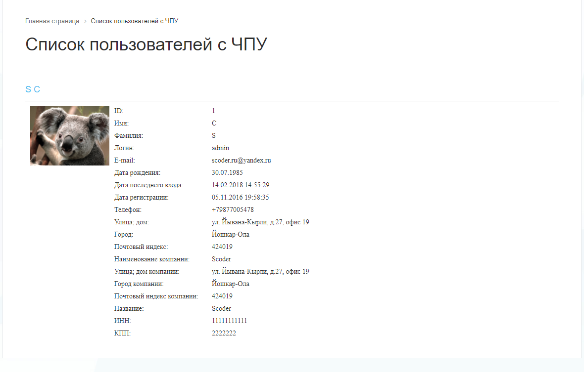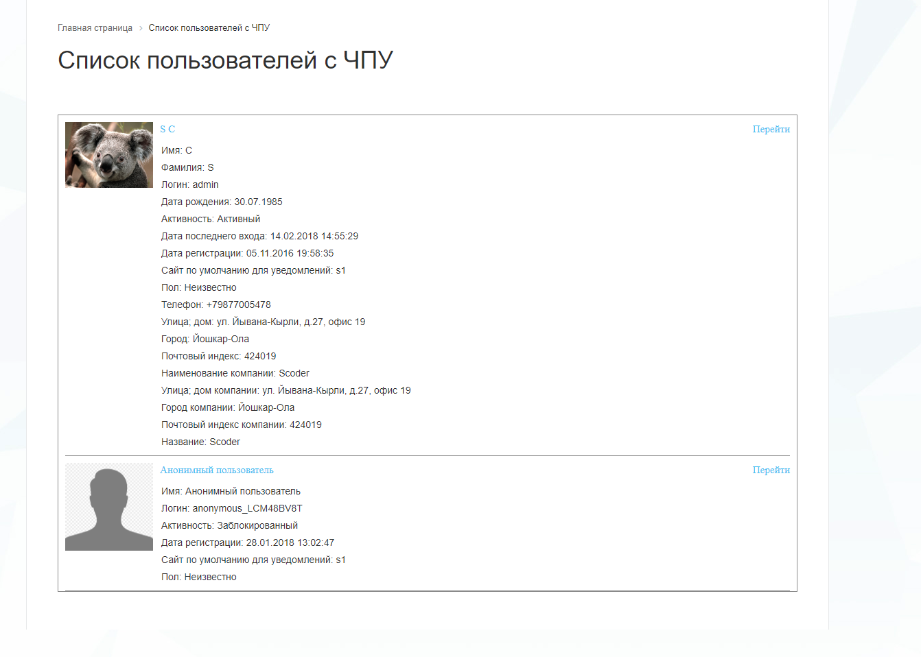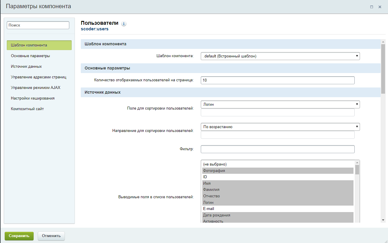 Модуль содержит ряд компонентов, включая комплексный, с помощью которого можно выводить список пользователей и детальную карточку по пользователю напрямую из базы пользователей. Данные компоненты имеют множество параметров и гибко настраиваются. Например, легко можно задать перечень отображаемых полей.