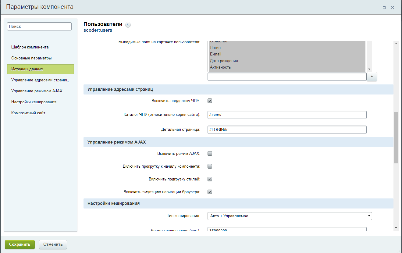Комплексный компонент поддерживает ЧПУ. Доступны макросы #LOGIN# (логин), #ID# (Ид пользователя).