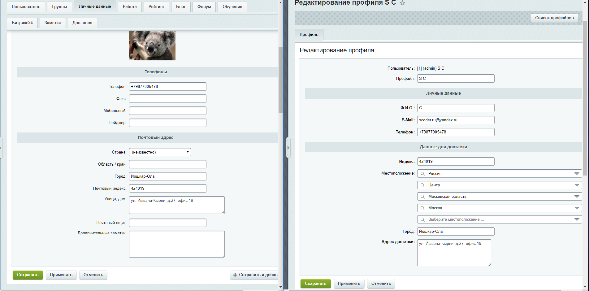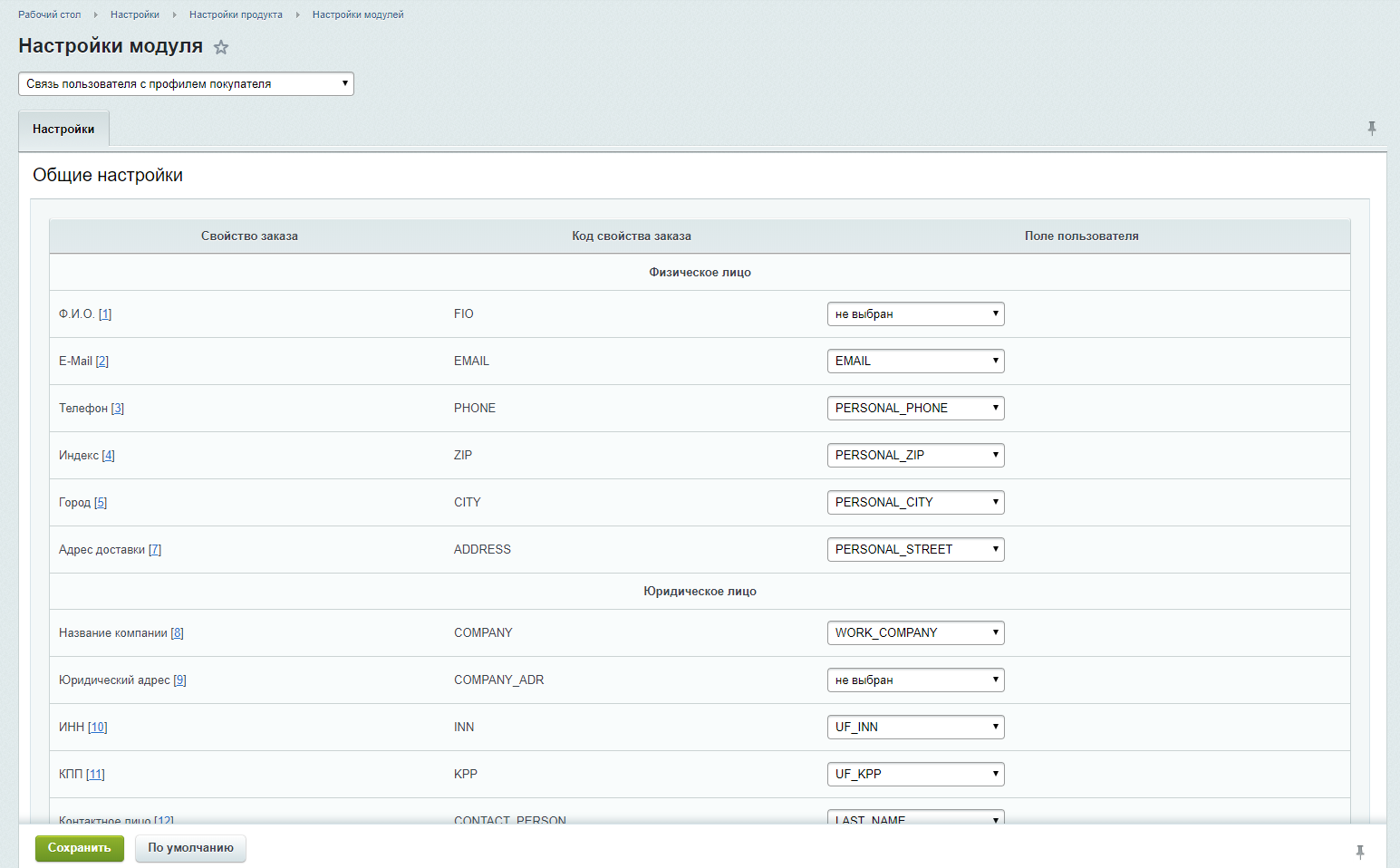 Наш модуль позволяет связывать эти 2 отдельные сущности: при изменении полей пользователя изменяются соответствующие свойства покупателя. Следствием чего является, что в форме заказа у авторизованных пользователей свойства заказа равны соответствующим полям пользователя.