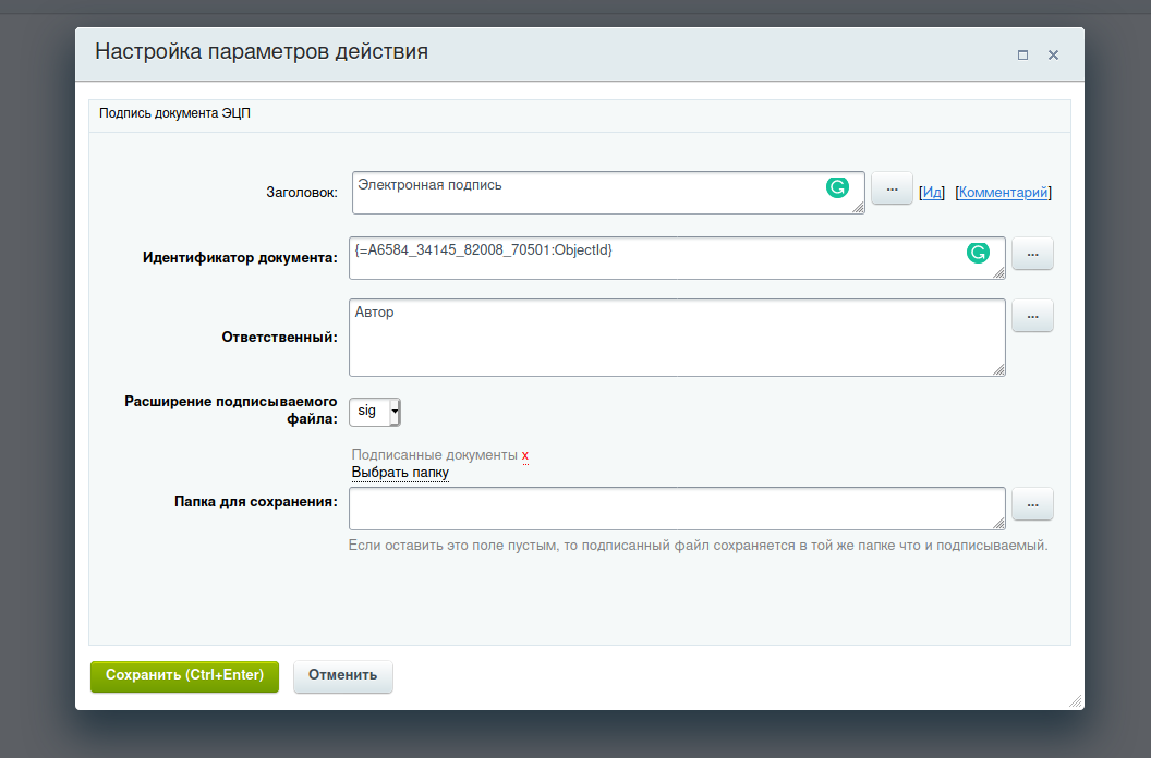 - Папка для сохранения файла на Битрикс.Диск. Если папка не указана, то подписанный файл сохраняется в той же папке, что и подписываемый. Тип подписи - присоединенная.