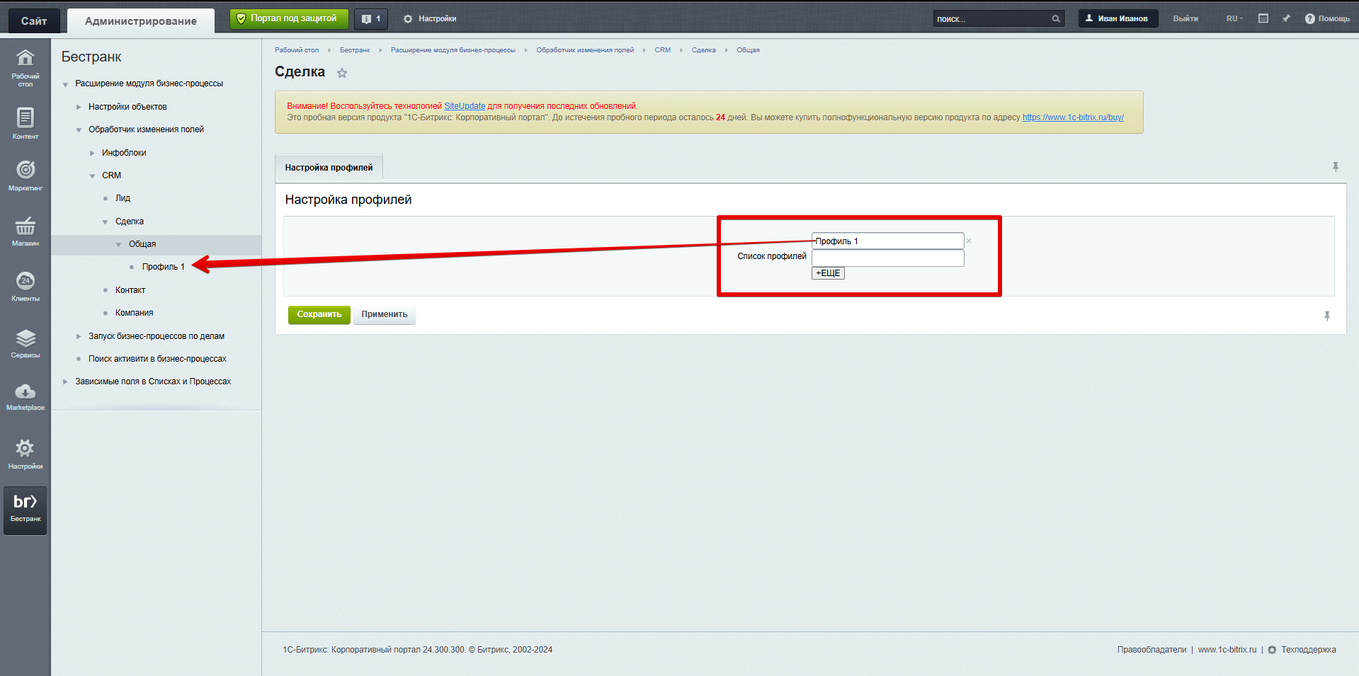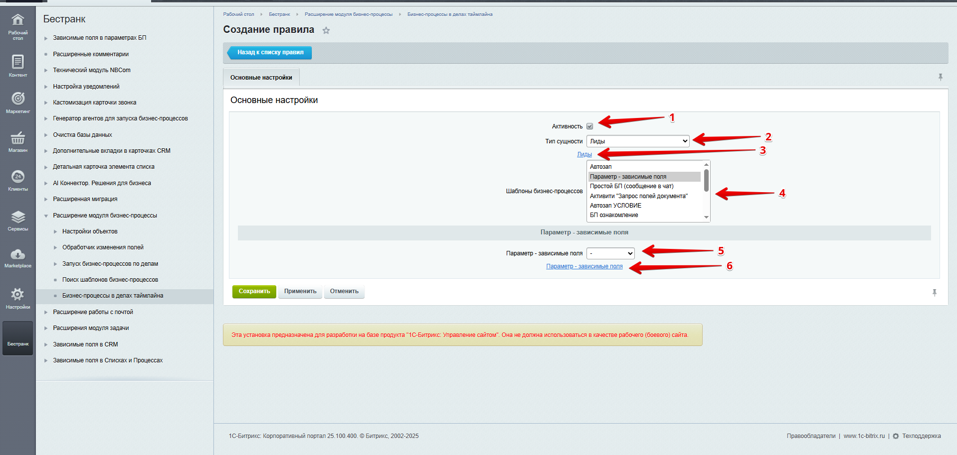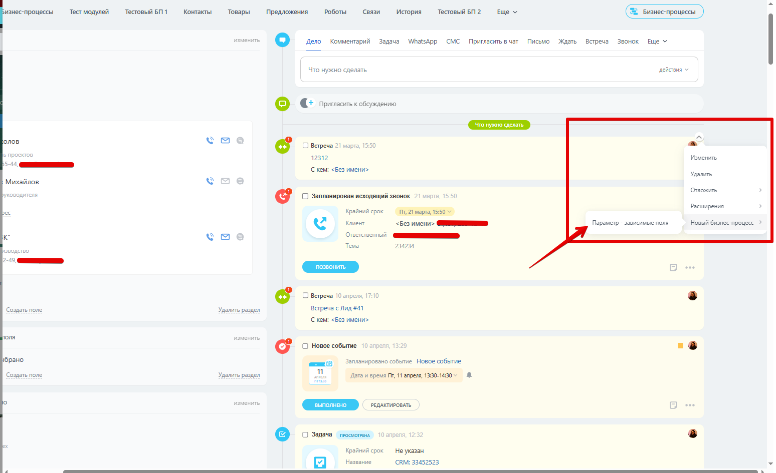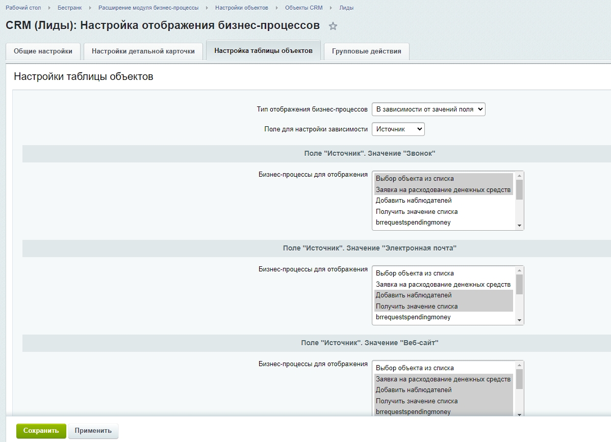- Указывать, какие бизнес-процессы показывать в карточках CRM в зависимости от значения поля