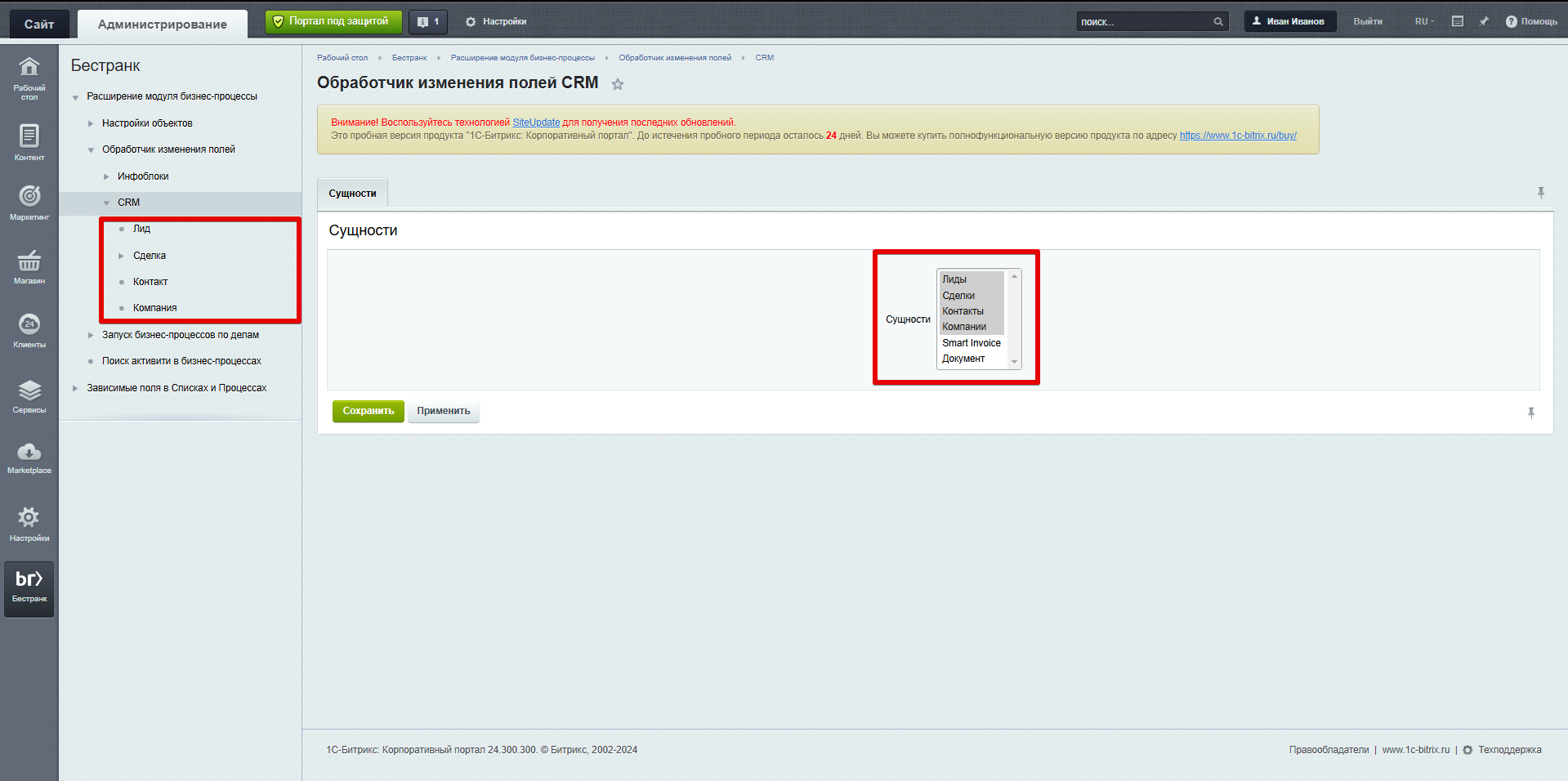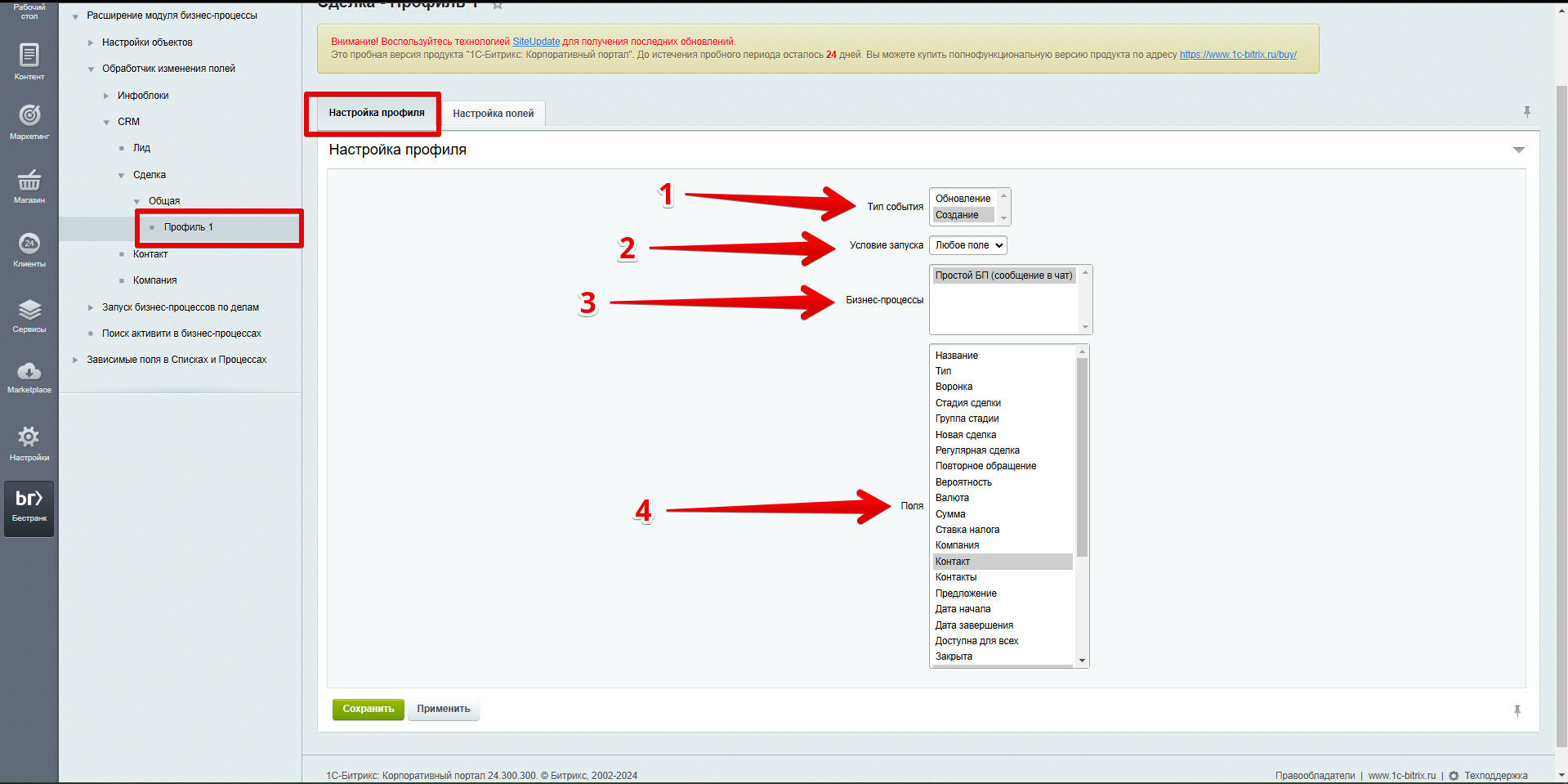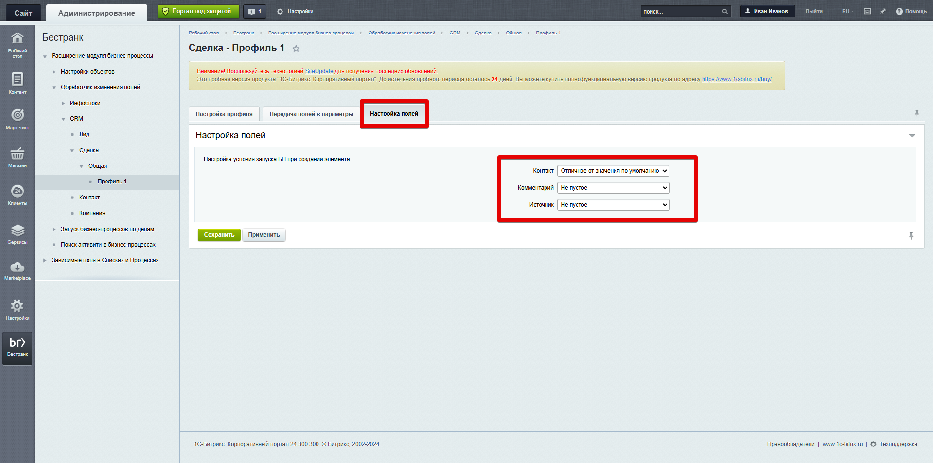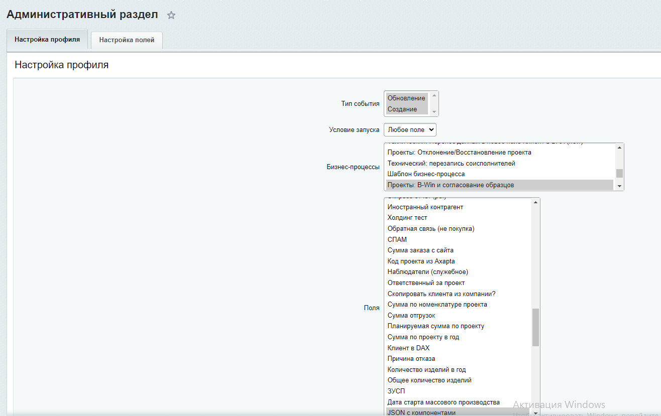 - Выбрать поля, при изменении которых будут запускаться бизнес-процессы