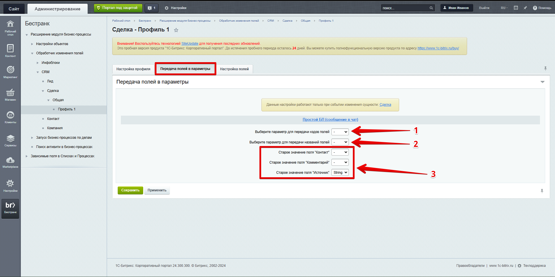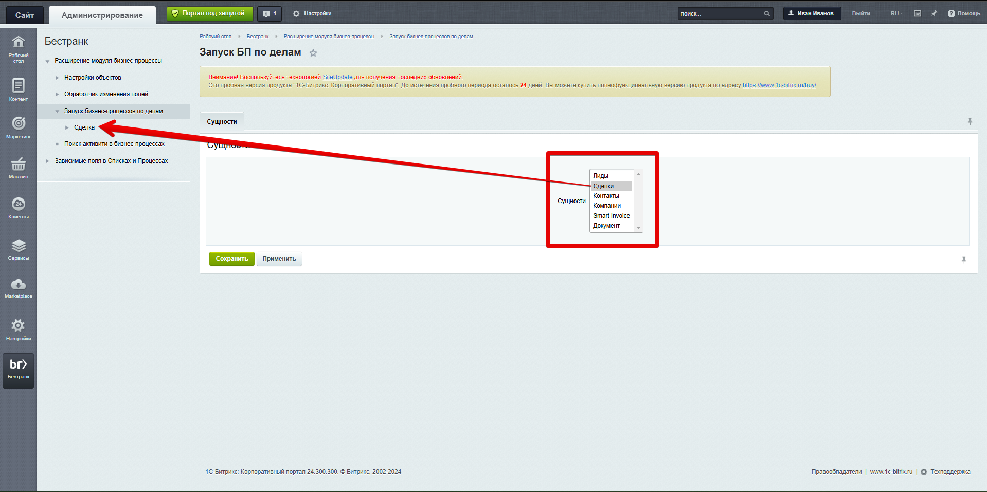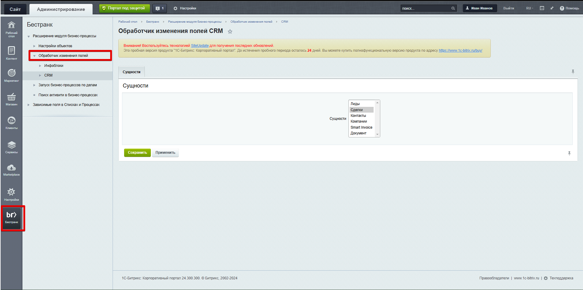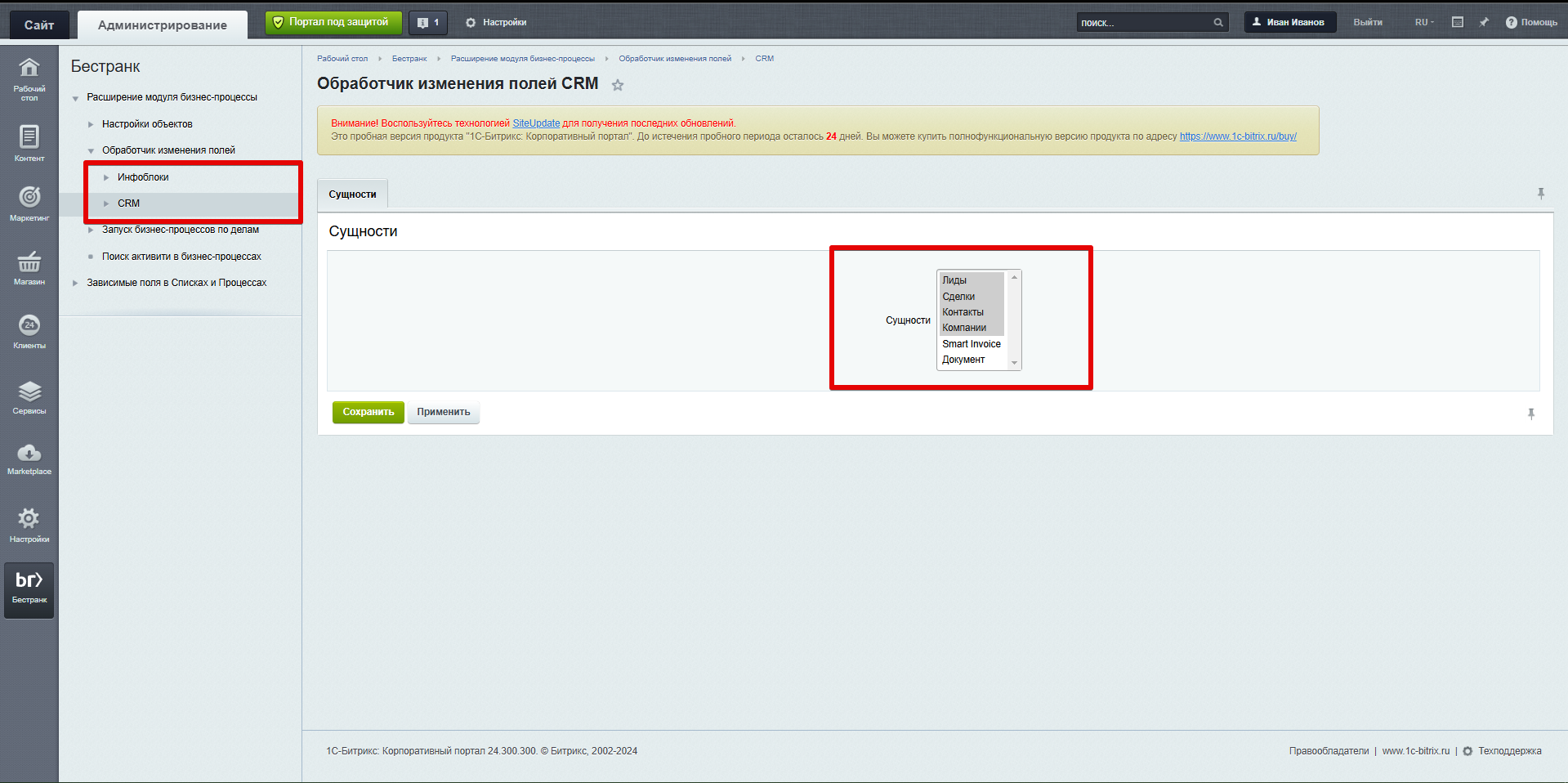 - Выбрать поля, при изменении которых будут запускаться бизнес-процессы