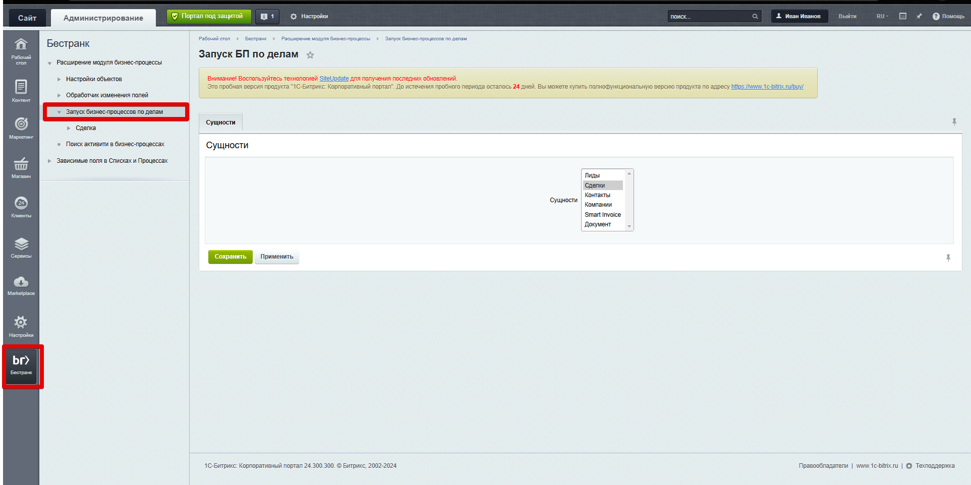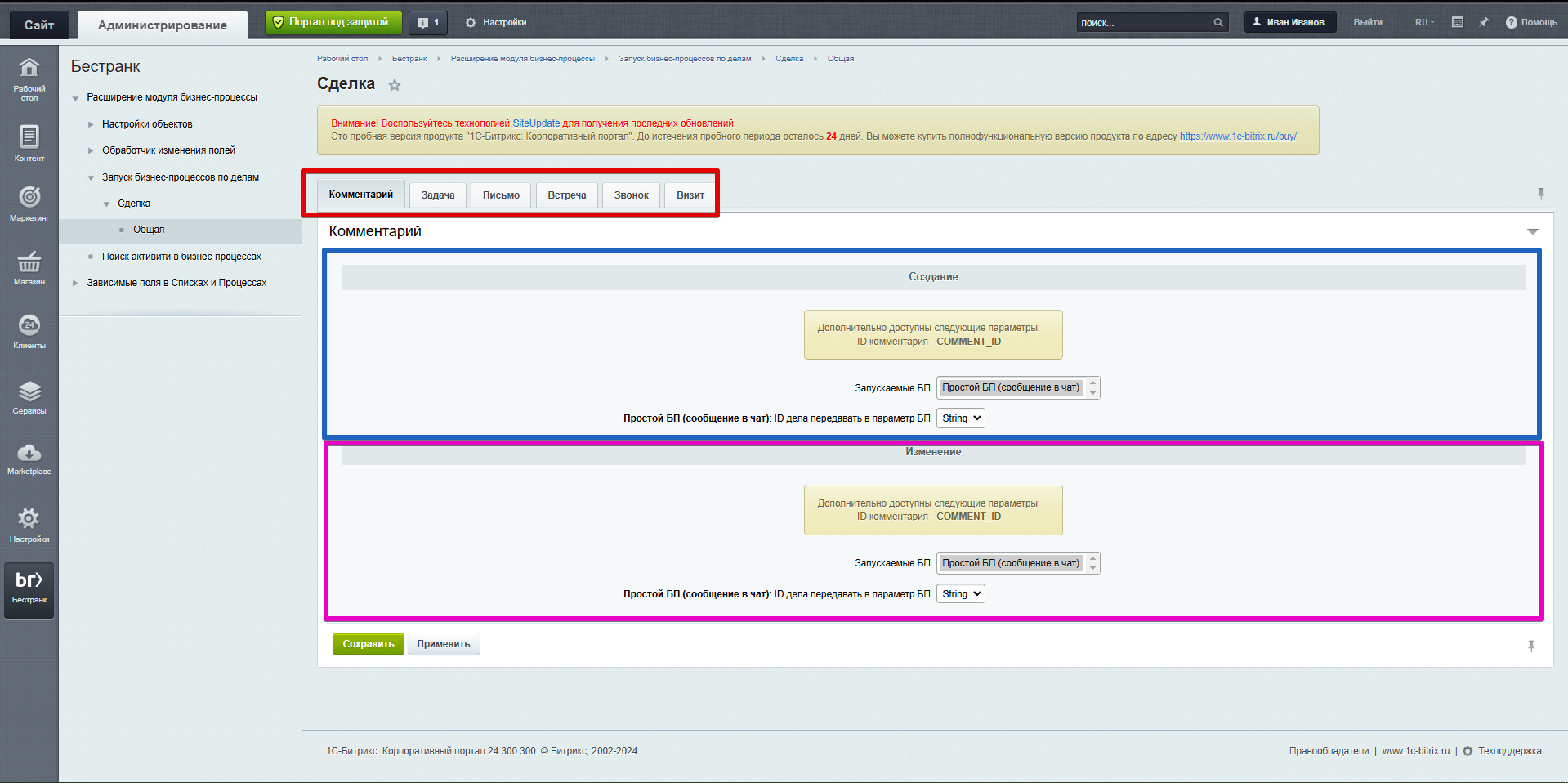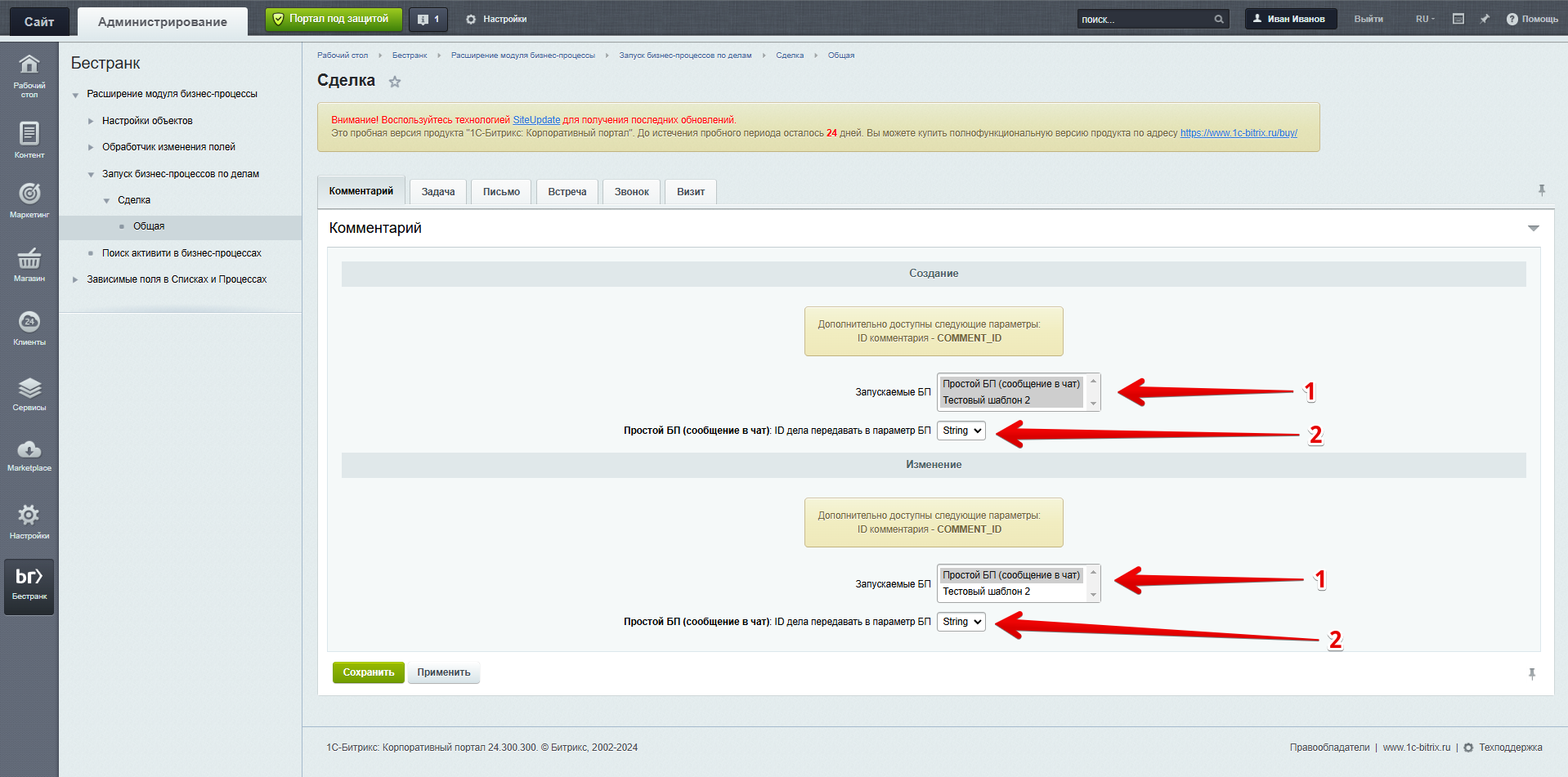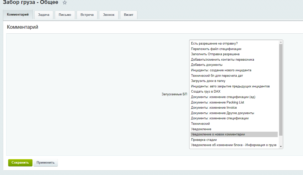 - Запускать бизнес-процесс при добавлении/изменении дела или комментария к карточке CRM
