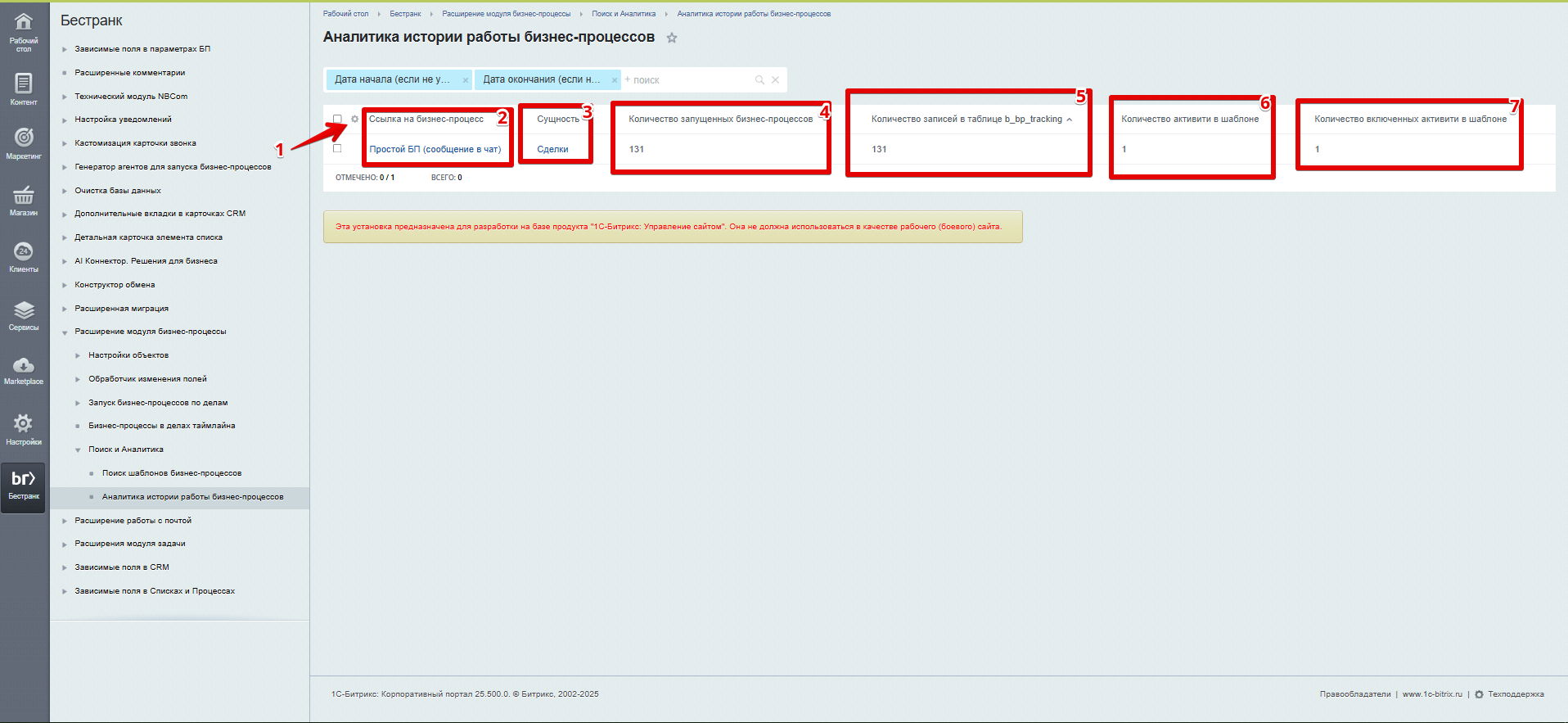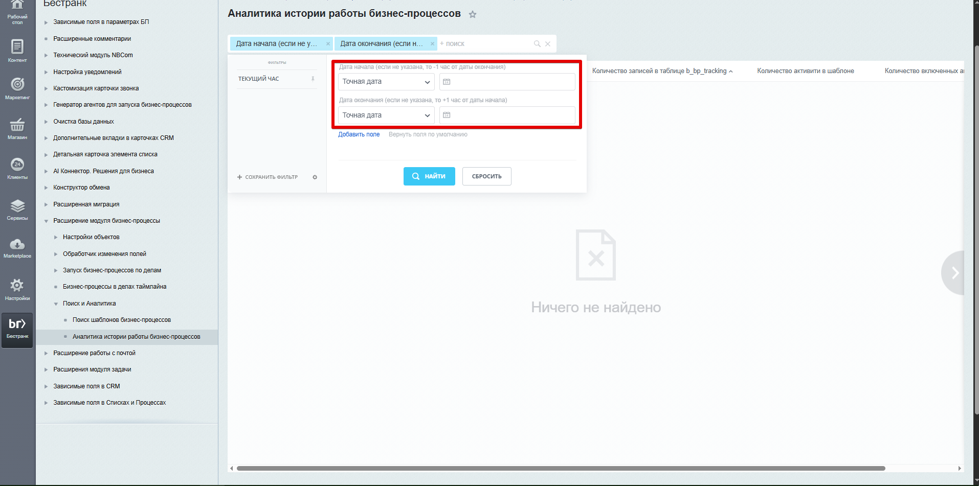 - Строить аналитику на основе запущенных в выбранный промежуток времени бизнес-процессов