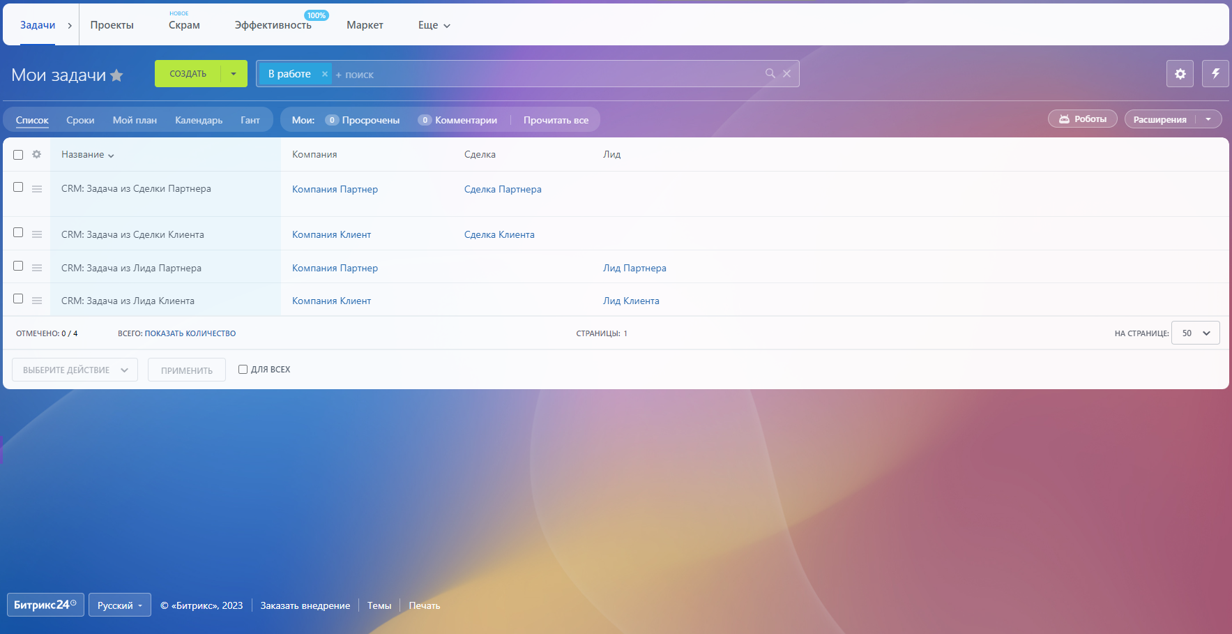 Сопоставление и привязка компании из сделки или лида в задачу происходит автоматически.