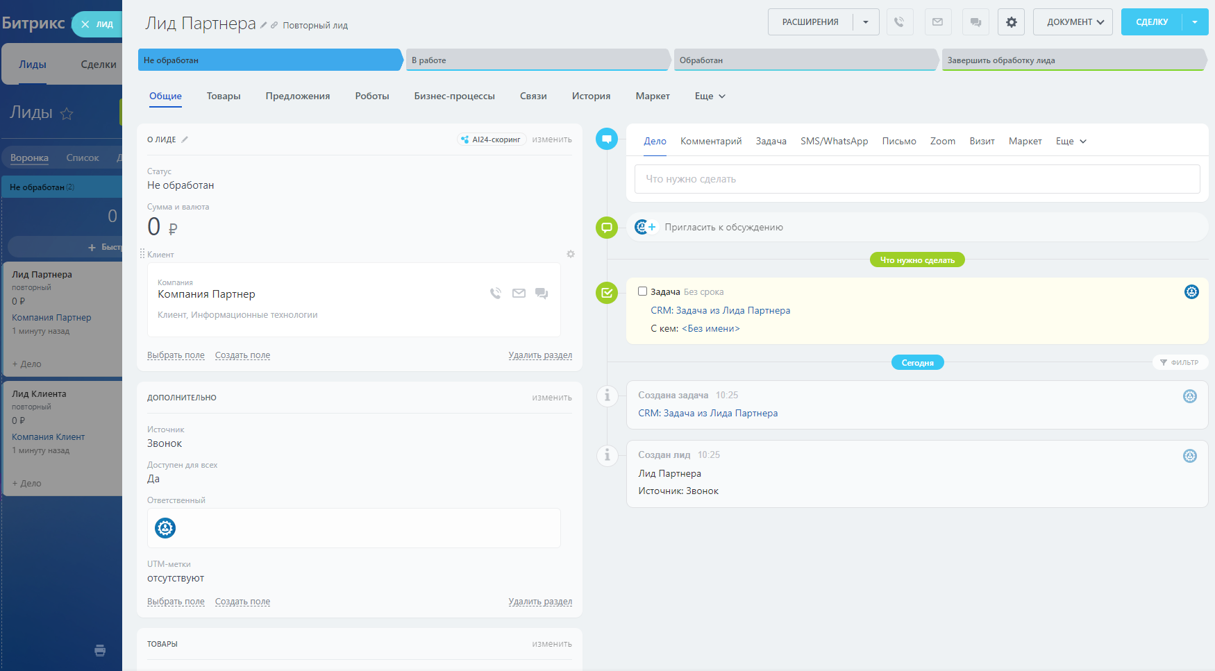 - Вы создаёте задачу из карточки Сделки/Лида.