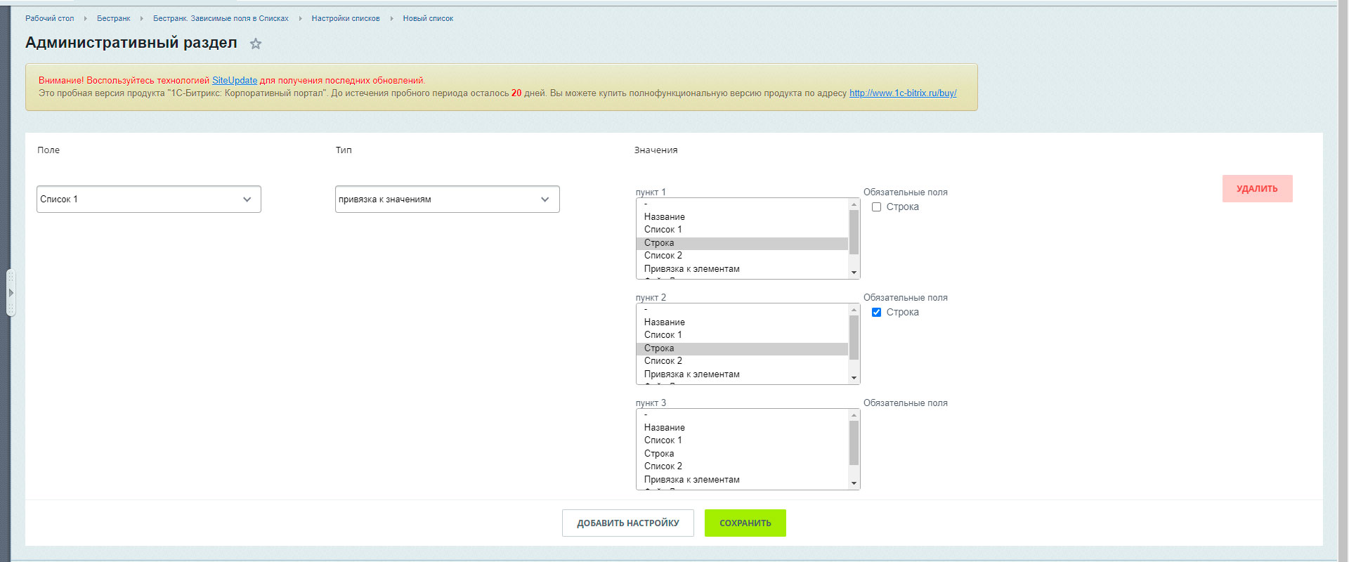 - Зависимые поля привязываются к значениям родительского поля (для списочных полей, полей с типом привязка, да/нет)