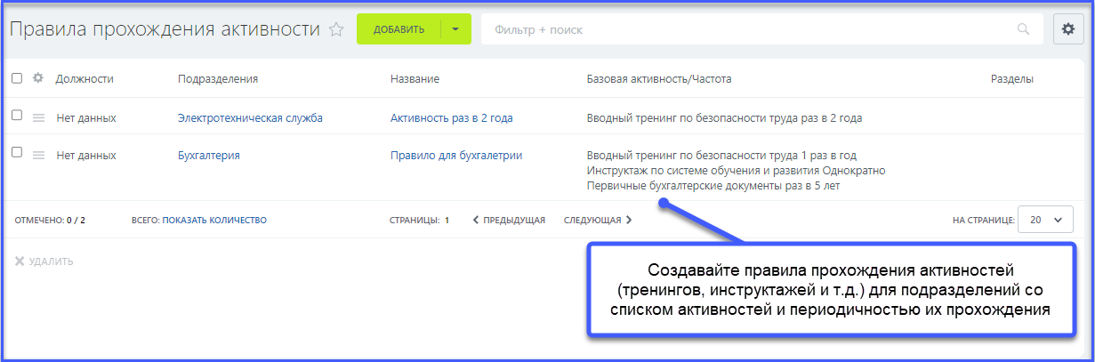 Настройте правила прохождения активностей для должностей и/или подразделений, задайте рекомендуемые периоды прохождения активности в году и периодичность повторного прохождения активности.