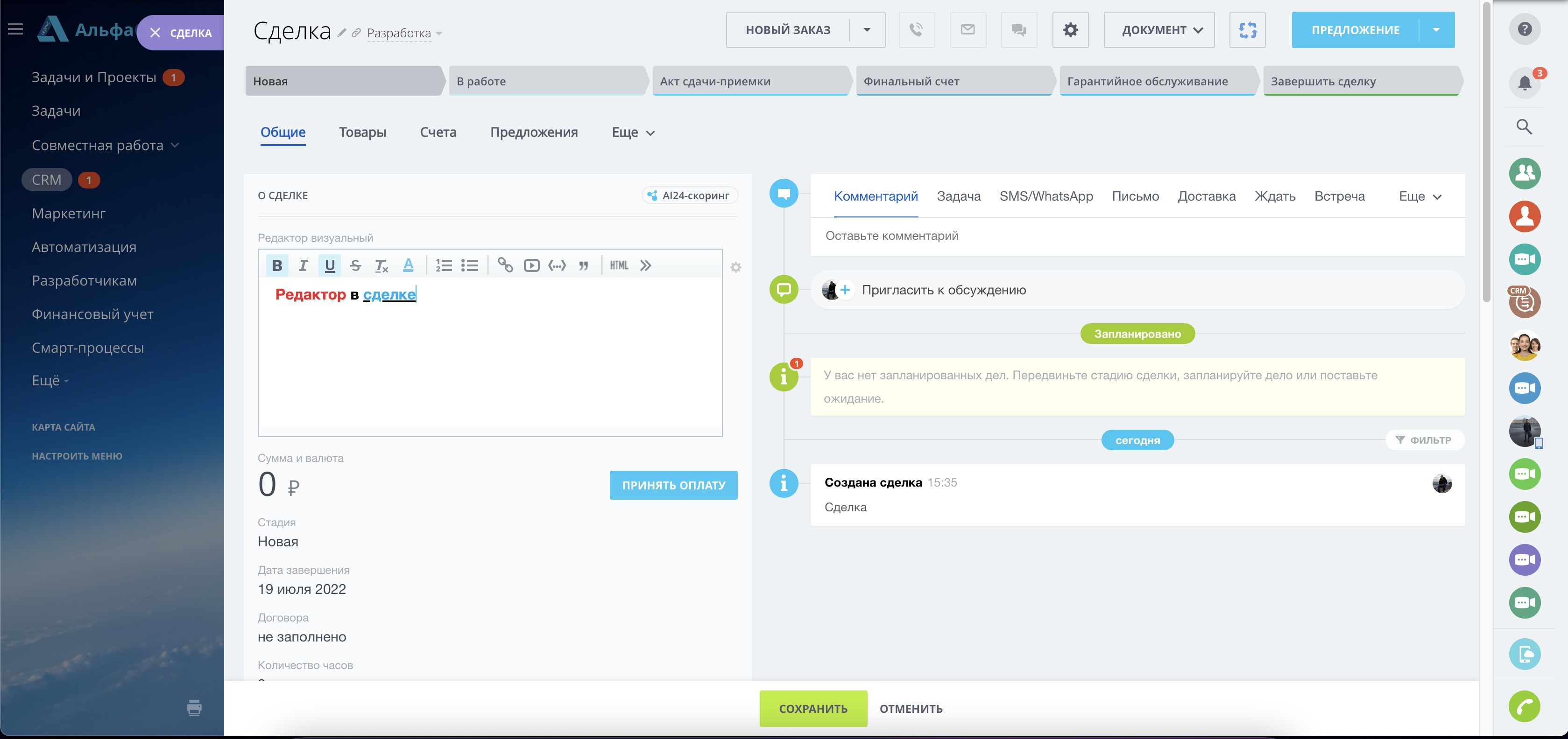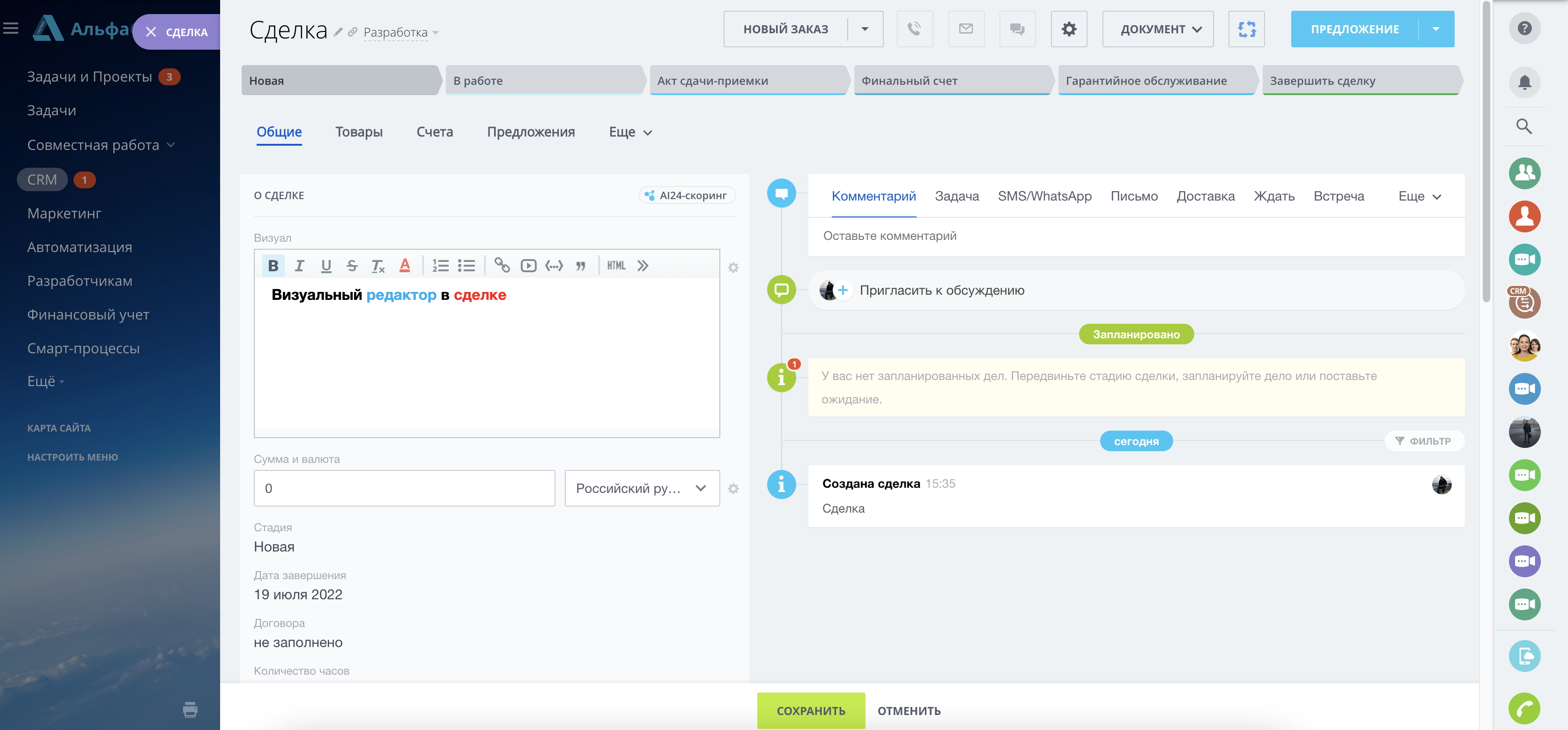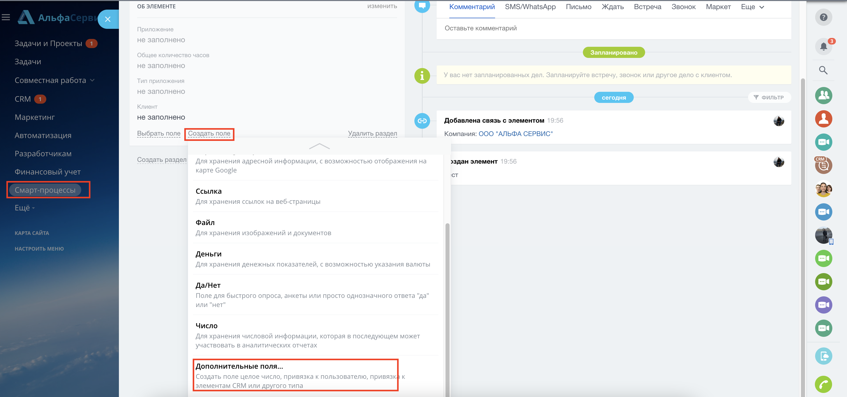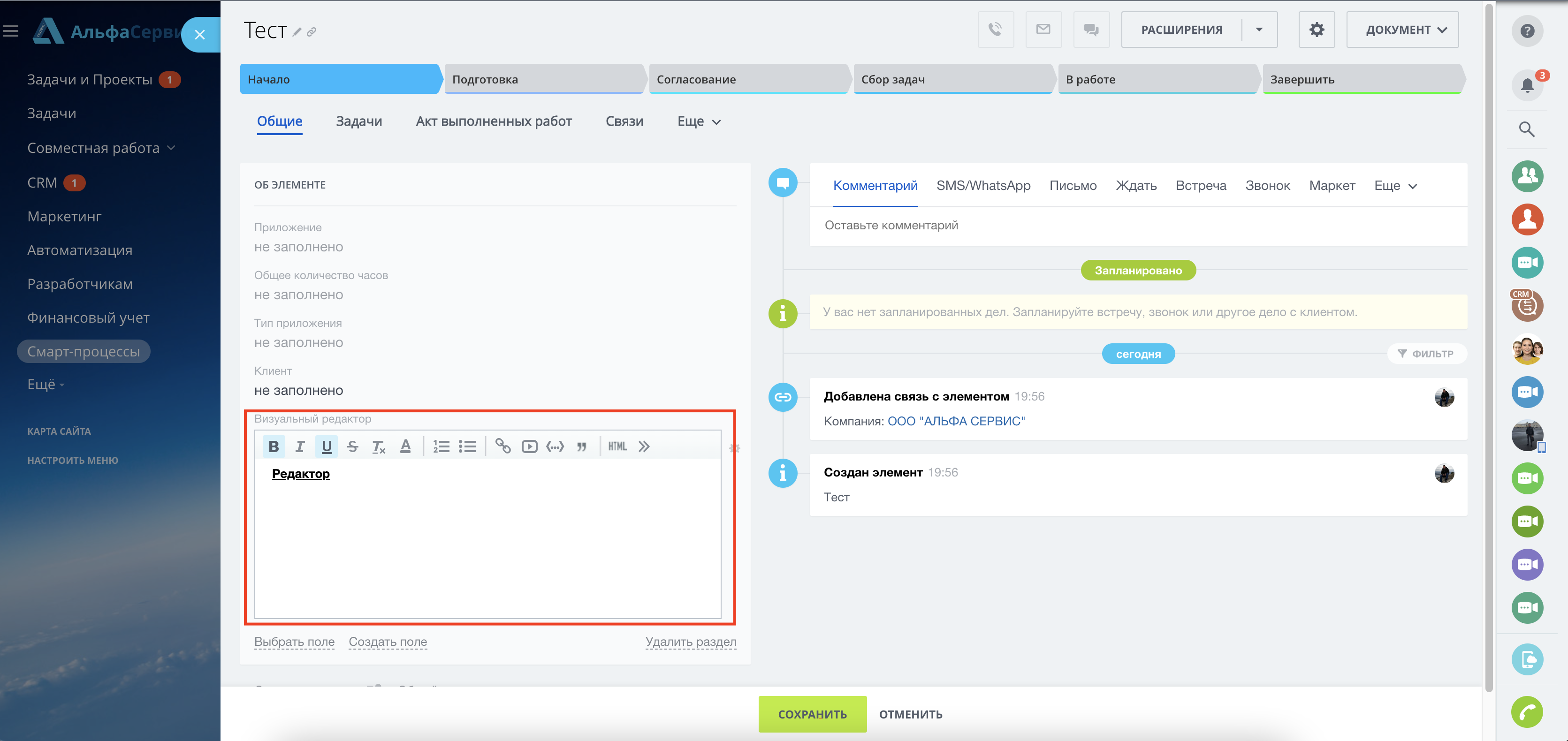- Смарт-процесс - добавить можно прямо из карточки. Создать поле -> Дополнительные поля -> Визуальный редактор