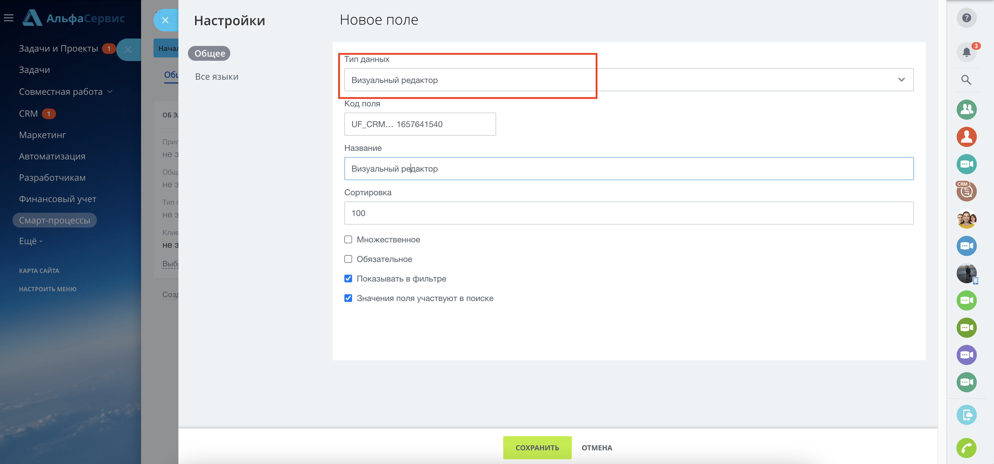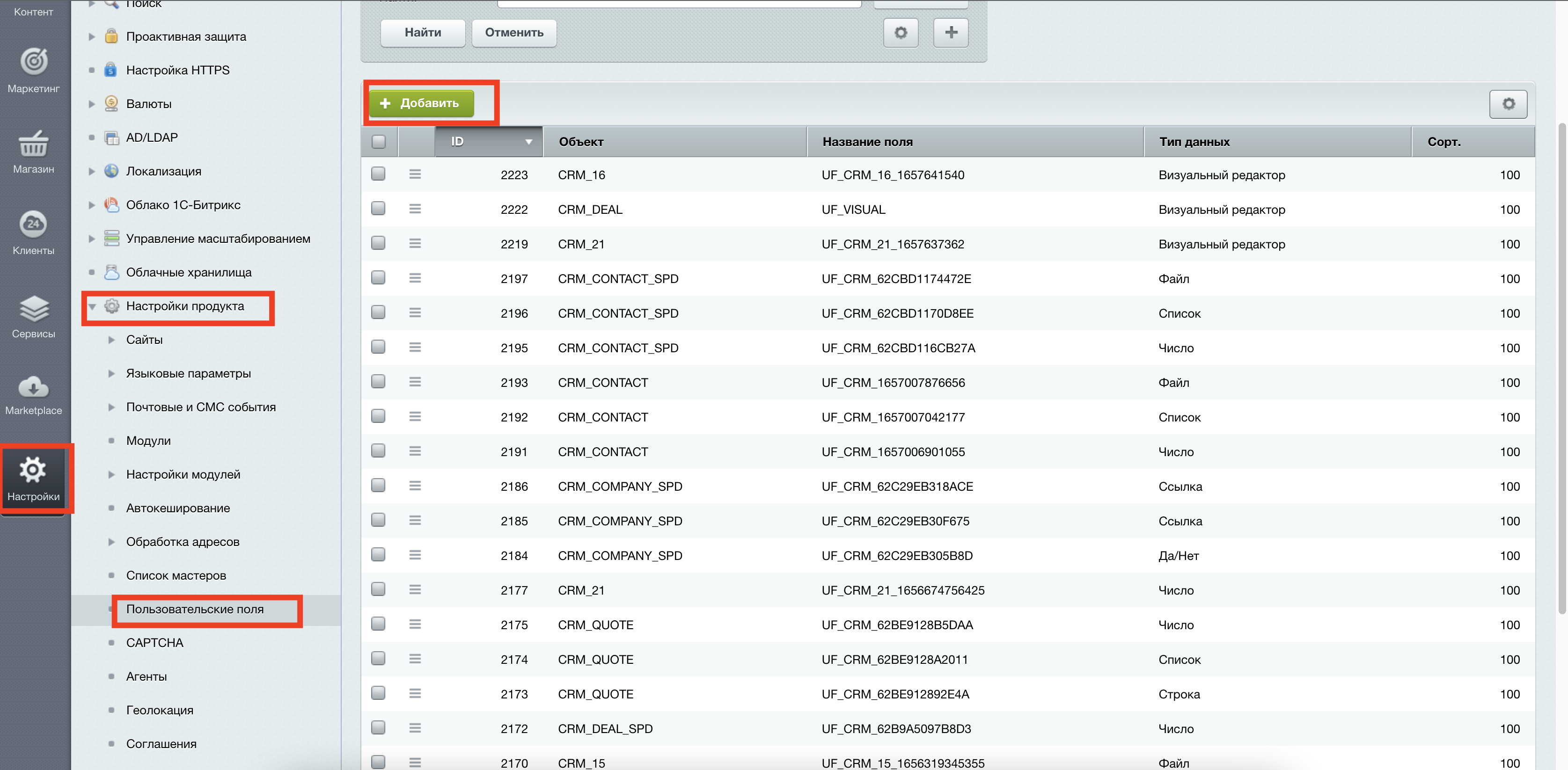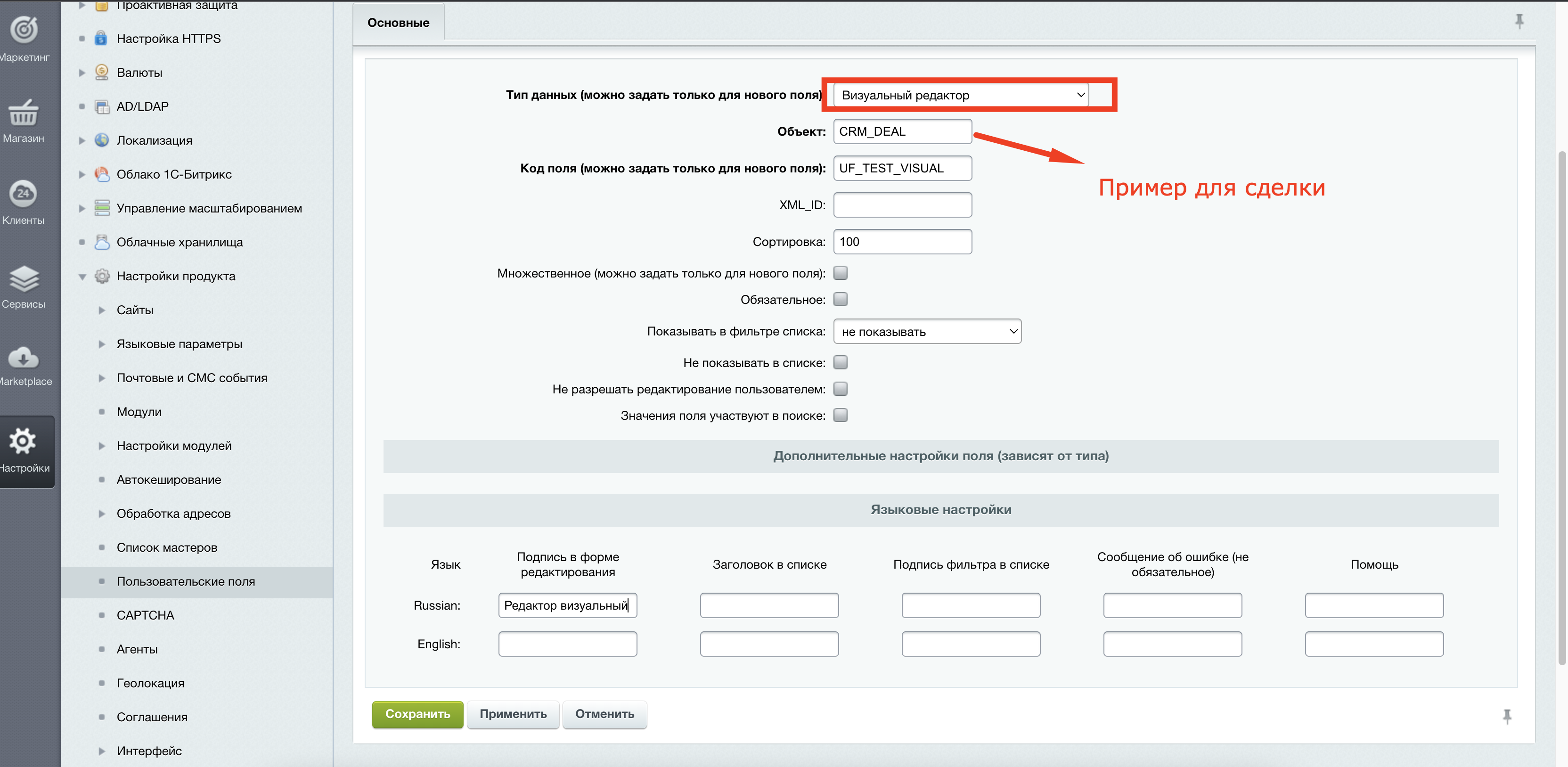 - Стандартная сущность CRM, например сделка. Стандартные сущности поддерживают только определенный список типов и через карточку добавить не получиться, поэтому заходим в "Панель администратора" -> "Настройки" -> "Настройки продукта" -> "Пользовательские поля" -> "Визуальный редактор"