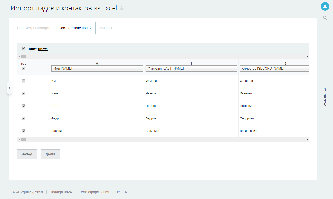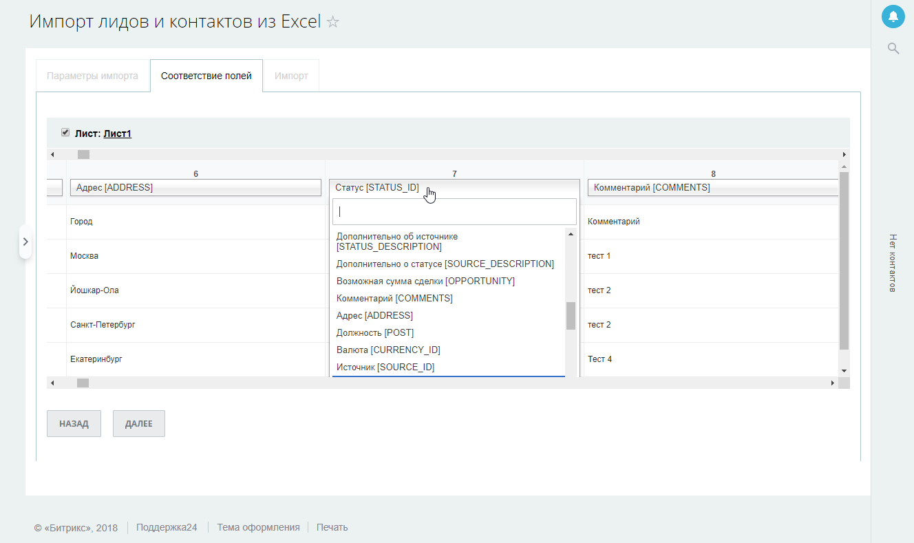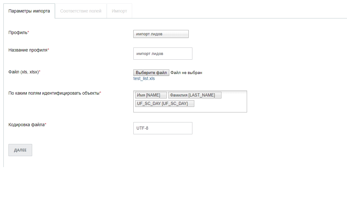 С помощью модуля появляется возможность обрабатывать Excel-файлы и добавлять объекты CRM. Достаточно настроить профили: настроить соответствия полей (столбцов) Excel-файла, полям (также поддерживаются пользовательские поля (UF_*)) объектов CRM.