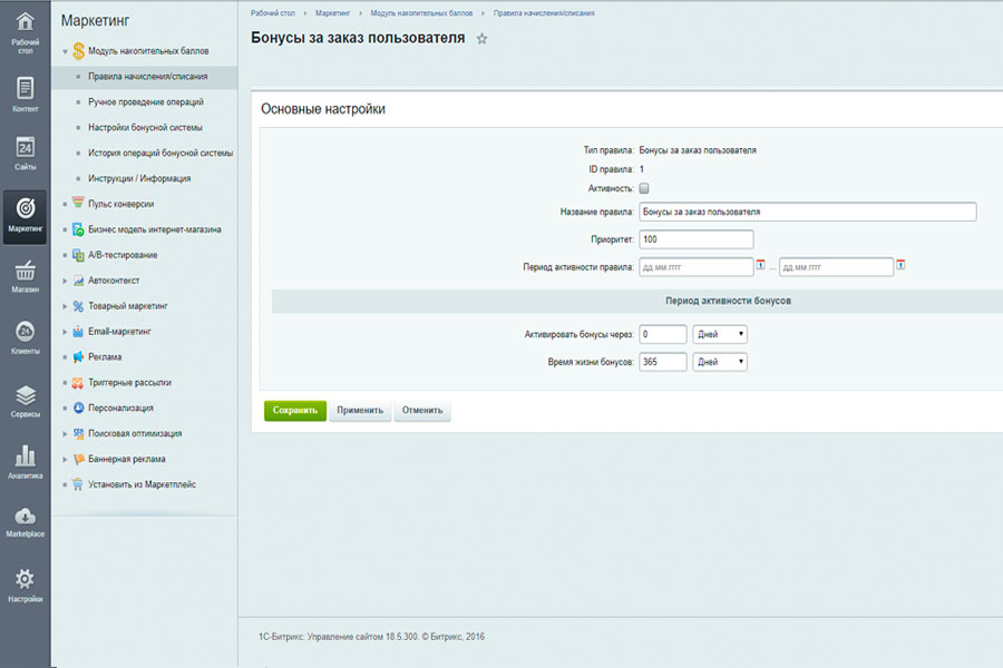 - период активности правила начисления бонусов (можно создать акцию по датам),