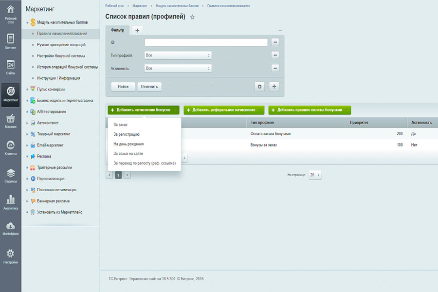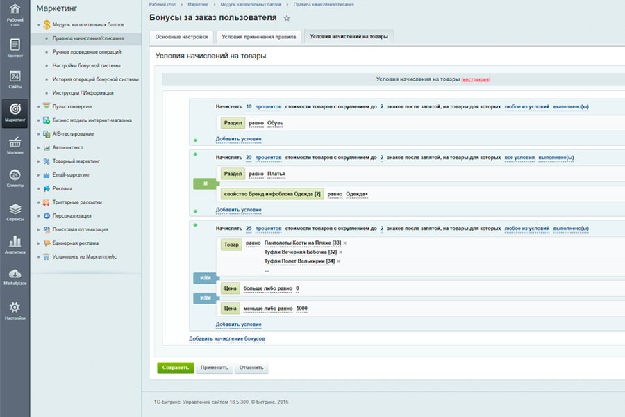 - Настройка практически любого сценария начисления бонусов для разных пользователей, для разных условий и товаров;