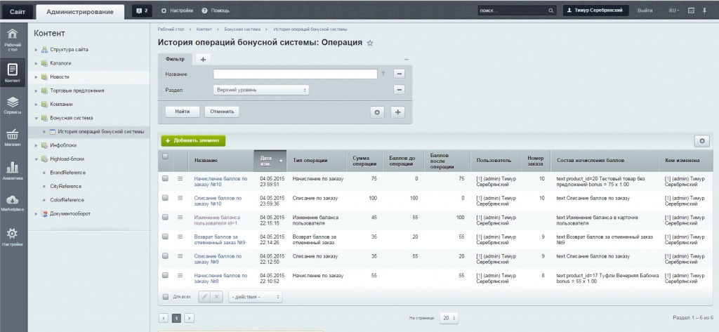 - Информация о движении бонусов по заказу на странице заказа в админ панели.