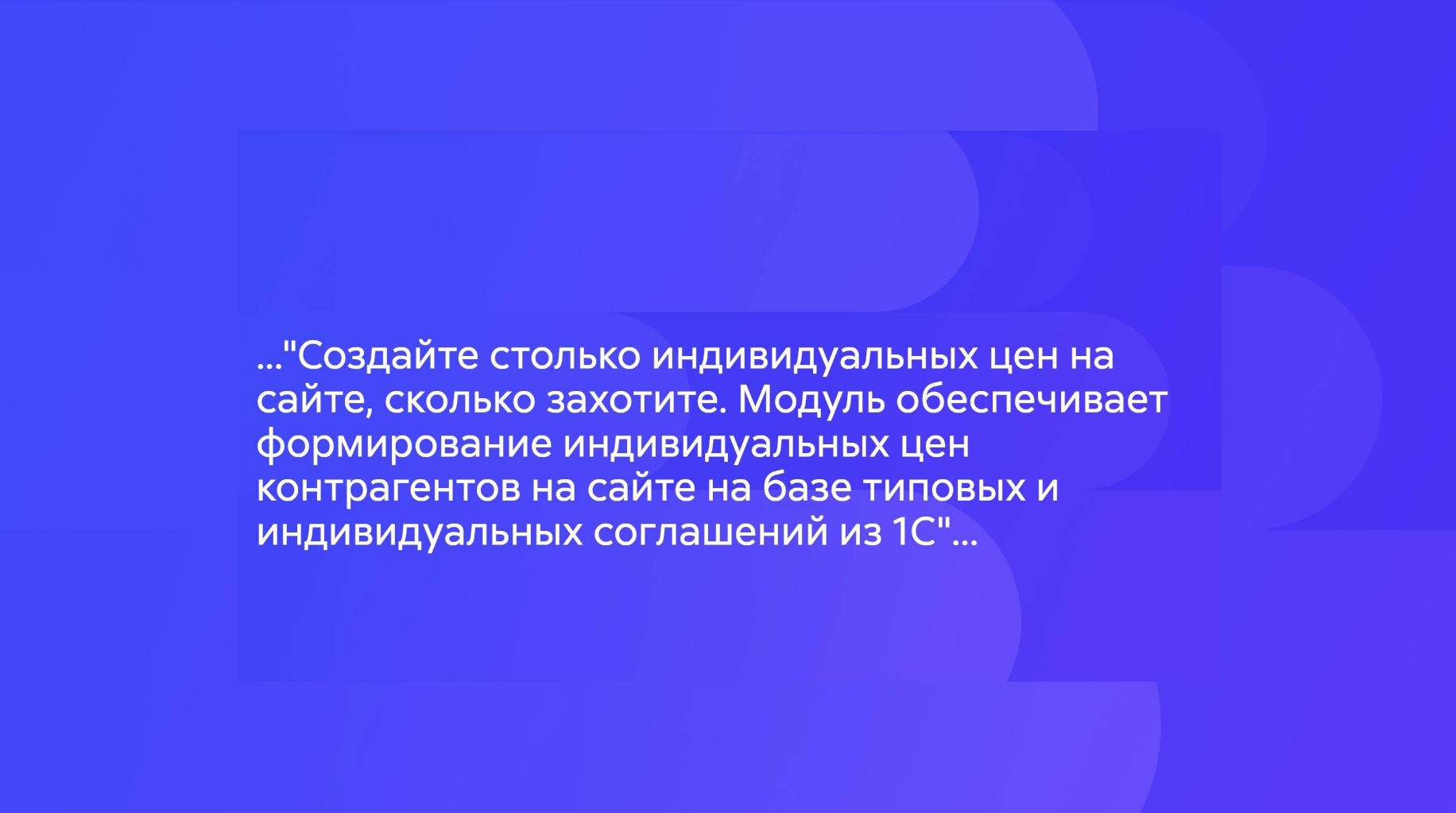 Создайте столько индивидуальных цен на сайте, сколько захотите. Модуль индивидуальных цен для Битрикс обеспечивает формирование индивидуальных цен контрагентов на сайте на базе типовых и индивидуальных соглашений из 1С. Каждый контрагент будет видеть свою цену из 1С.