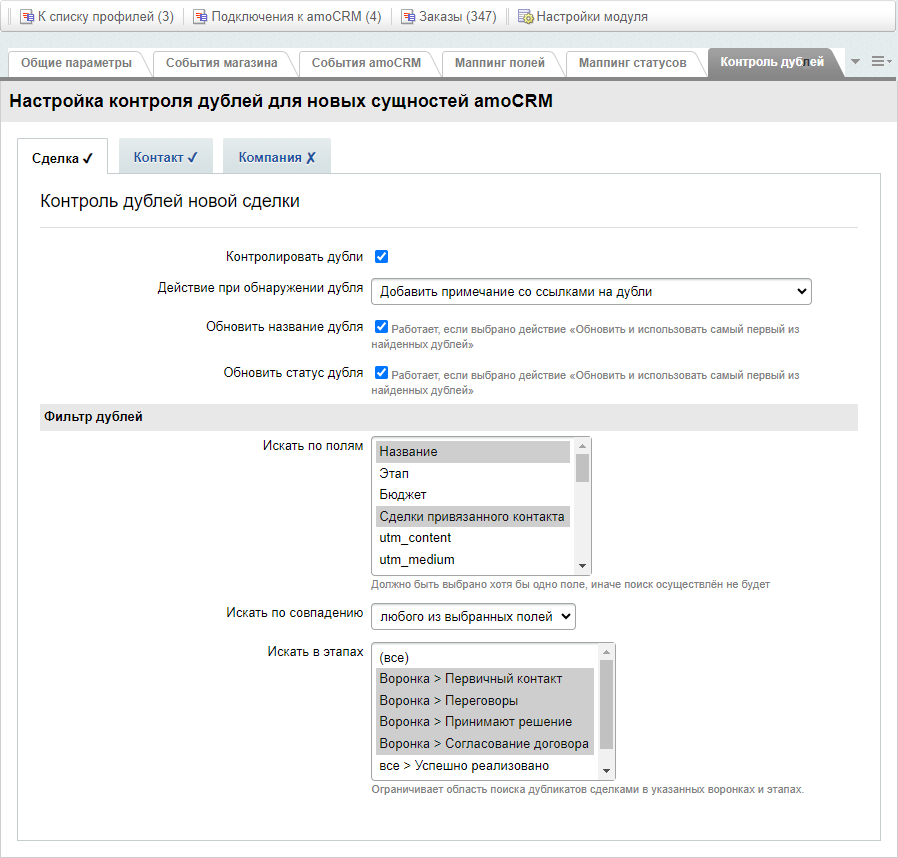 - Два способа контроля дублей со стороны модуля: встроенный бесплатный метод или с помощью платного API фильтрации амоСРМ.