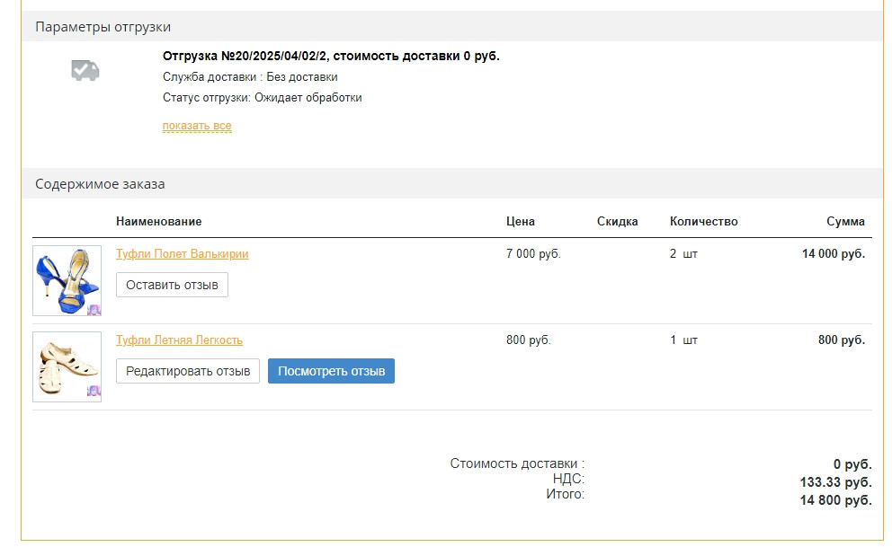 5. Возможность оставить отзывы не только в карточках товаров, но и в личном кабинете на детальной странице заказа без её перезагрузки.