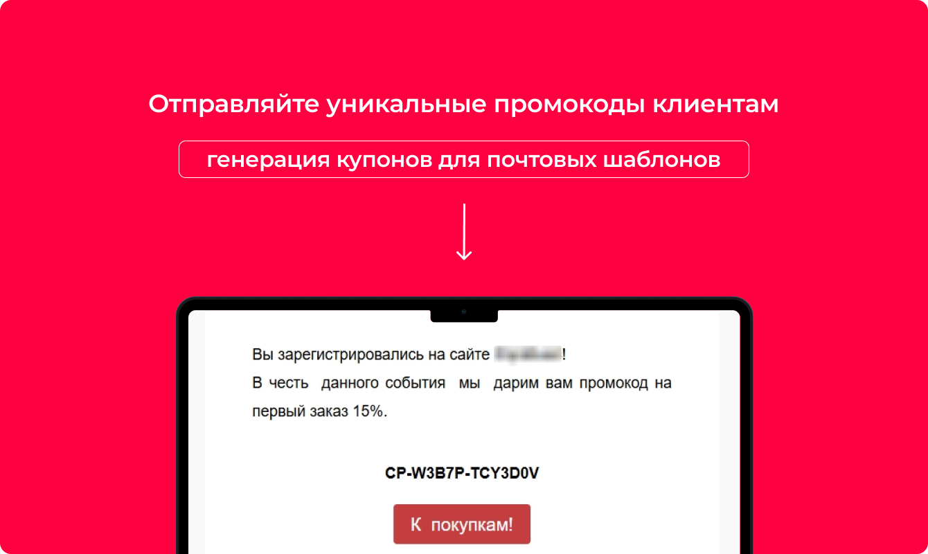 Сформулировать шаблон письма, с помощью которого клиенту будет отправляться промокод и вставить в него скопированный плейсхолдер (в админпанели: Настройки → Настройки продукта → Почтовые и смс события → Почтовые шаблоны);