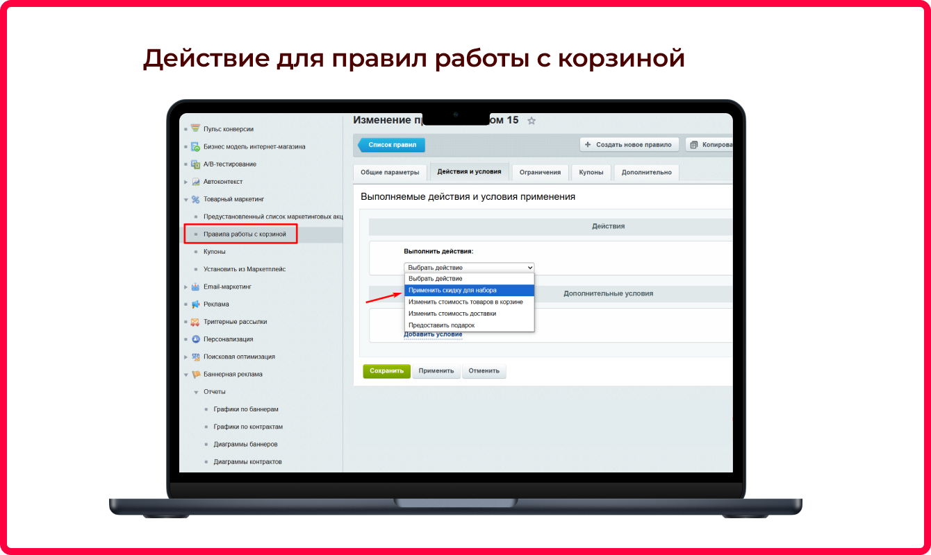 Перейдите на страницу Маркетинг > Товарный маркетинг > Правила работы с корзиной административного раздела 1С-Битрикс. Добавьте новое правило. Здесь важно уделить внимание вкладке “Действия и условия”.