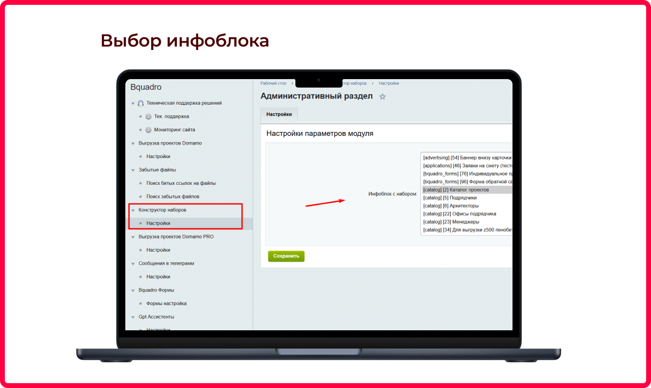 После установки и простой настройки модуля в форме редактирования элементов выбранного инфоблока появится вкладка “Bquadro: Состав набора”. Здесь вы выбираете:
