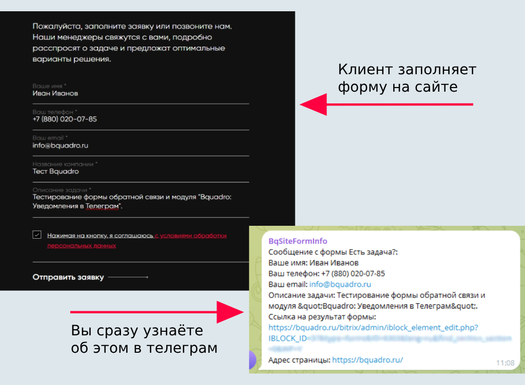 Моментальные сообщения о заявках с сайта теперь можно получать прямо в Телеграм! Наш модуль позволяет гибко настроить уведомления для разных ситуаций: