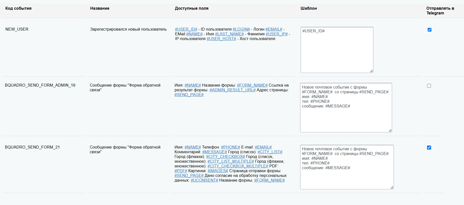 Модуль предназначен для отправки уведомлений в Telegram при возникновении определенных событий на вашем сайте. Решение позволяет гибко настраивать события, которые будут отслеживаться, и отправлять уведомления в указанный Telegram-чат.