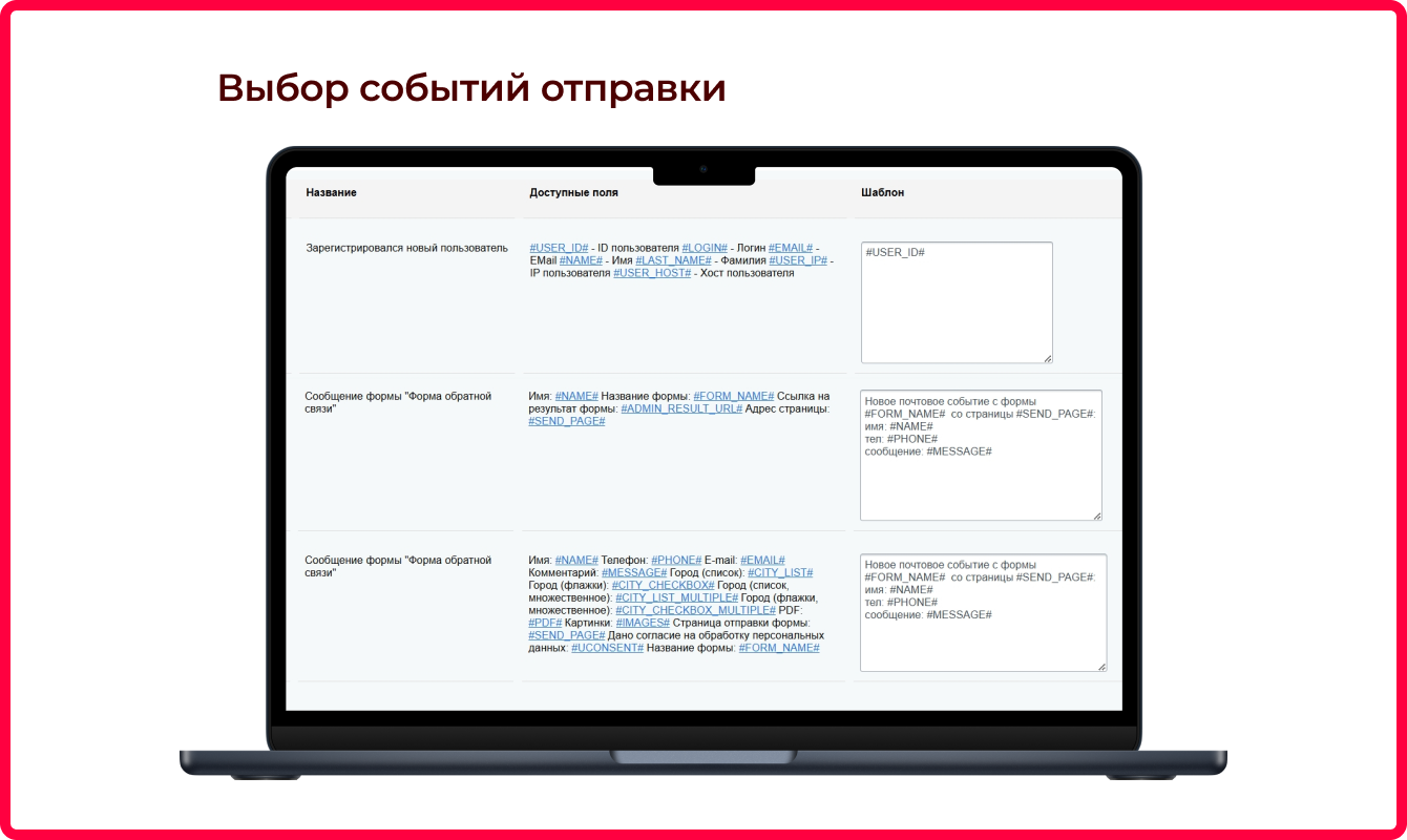 Гибкая настройка текста получаемых сообщений. Вы сможете создать шаблоны, в которых укажете ключи и имена полей, которые будут включены в сообщение.