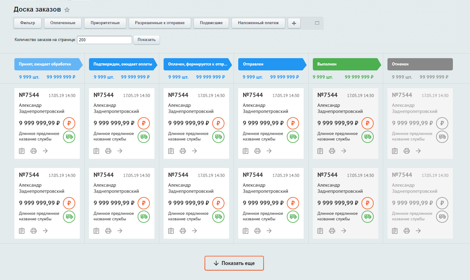 - возможность проставлять оплату и отгрузку заказа прямо на доске заказов.