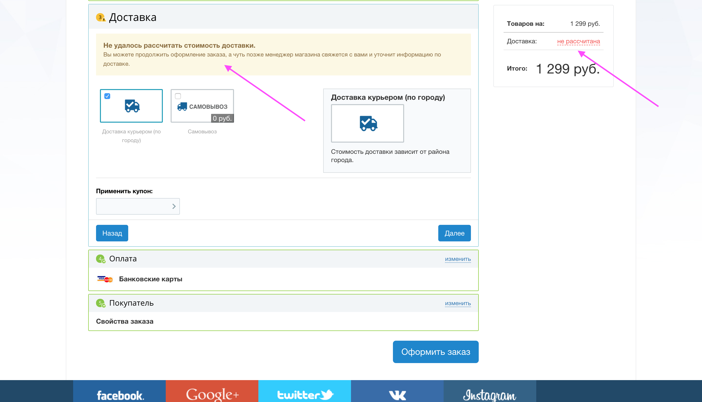 | Внимание! После того, как администратор магазина добавил стоимость доставки вручную, необходимо закрыть уведомление, о том, что стоимость не рассчитана, чтобы исчезла ошибка с заказом. |