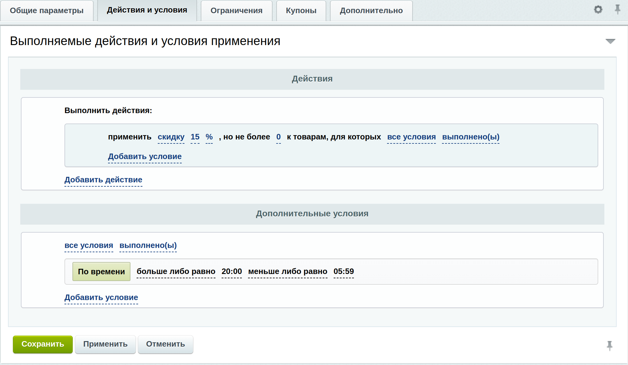 - По времени — позволяет задать скидку, которая будет действительна только в заданный период времени в течение дня.