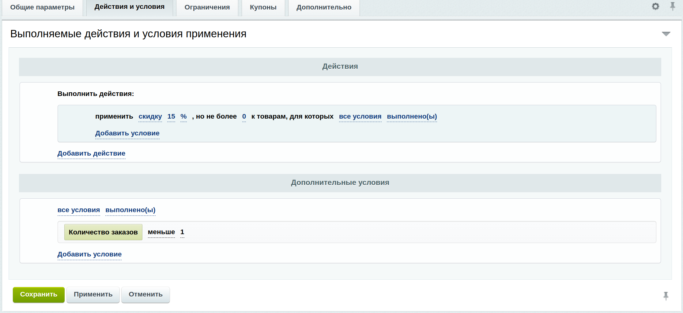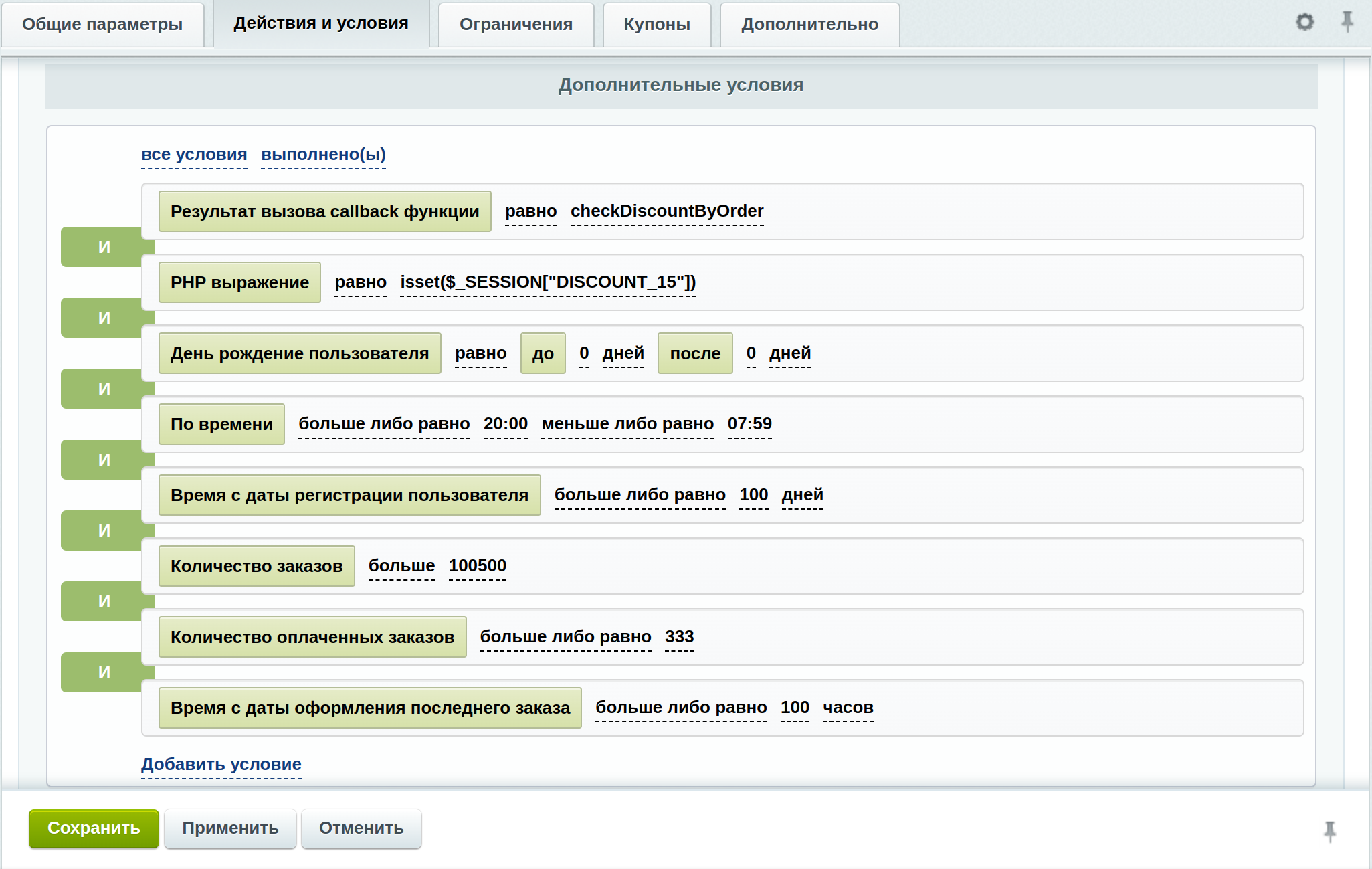 - День рождения пользователя — позволяет задать скидку в день рождения пользователя. Также можно указать, чтобы скидка начала действовать немного заранее, до начала дня рождения, и закончилась позже.
