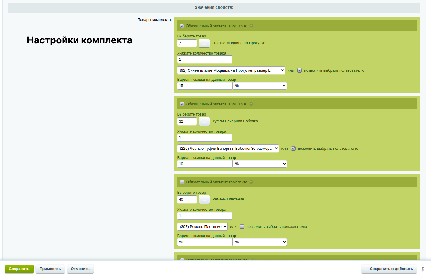 Администратор сайта может создавать наборы, ориентируясь на особенности товаров и потребности покупателей.