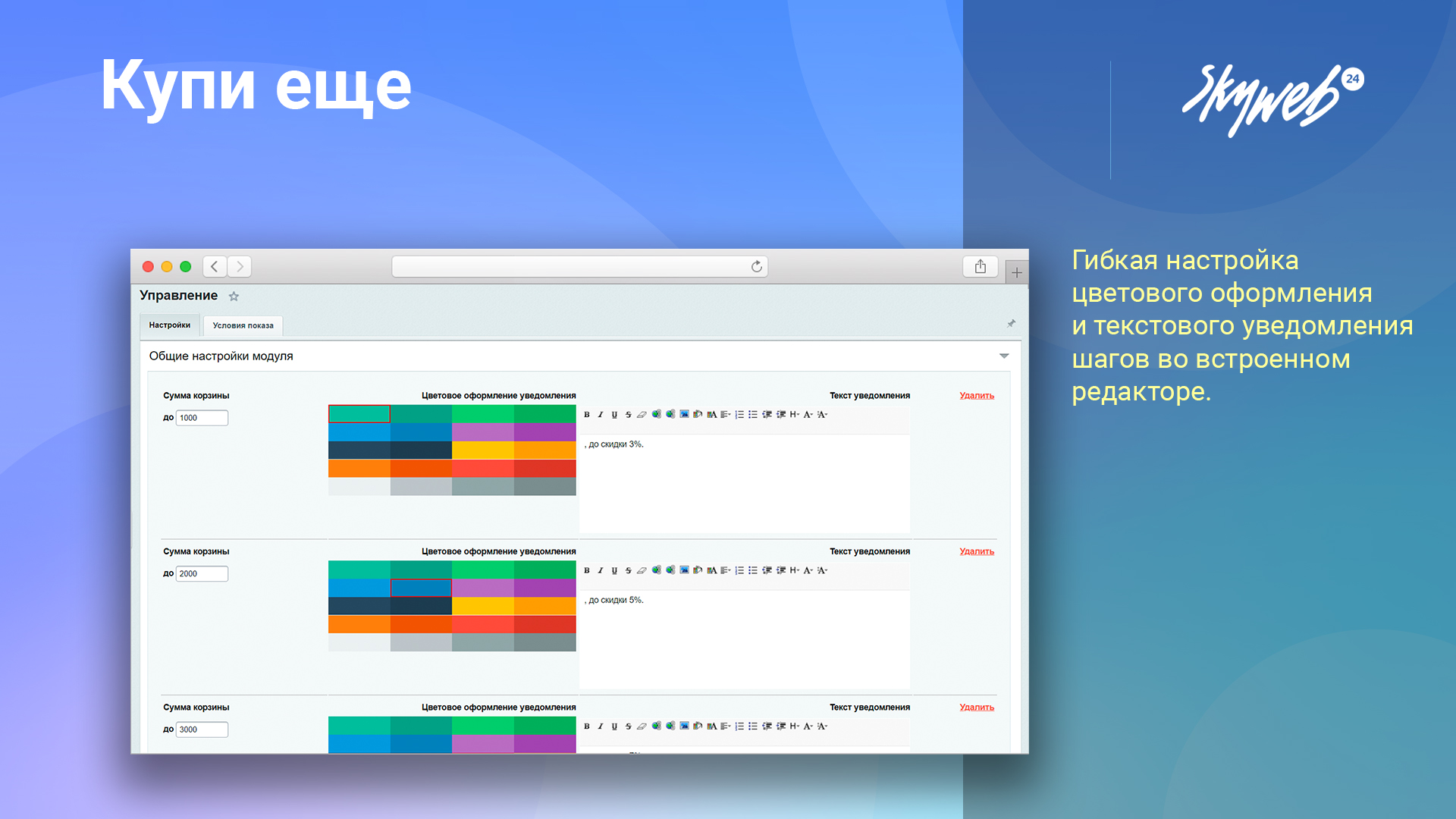 Модуль «Купи Еще» - это инструмент, который поможет вам увеличить средний чек в интернет-магазине. Он предоставляет покупателям информацию о доступных акциях, скидках, условиях доставки и других предложениях. Модуль представлен в виде компонента, который можно легко вставить на любую страницу вашего интернет-магазина, например, на страницу с корзиной или детальную страницу товара.