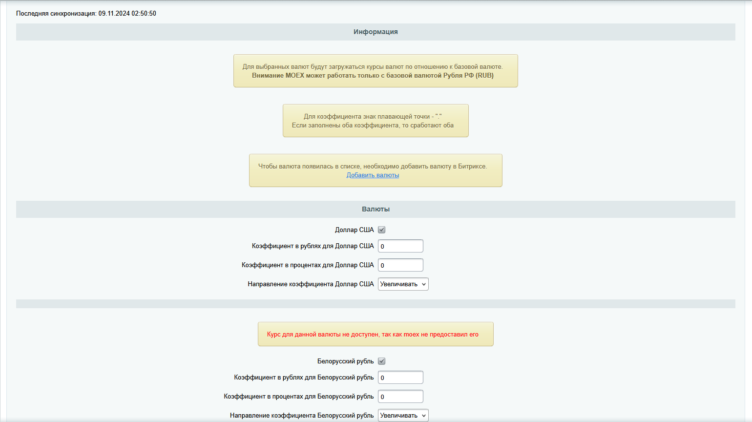 Модуль работает с функционалом "Валюты" модуля "Интернет-магазин" Битрикса.