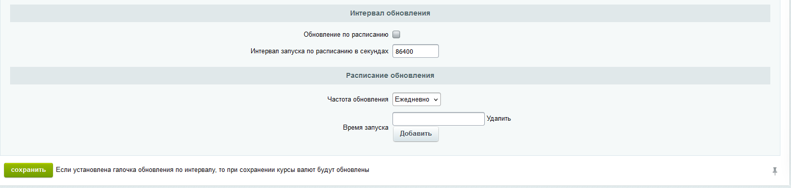 Возможность обновления курсов валют в определенное время и через заданный интервал.