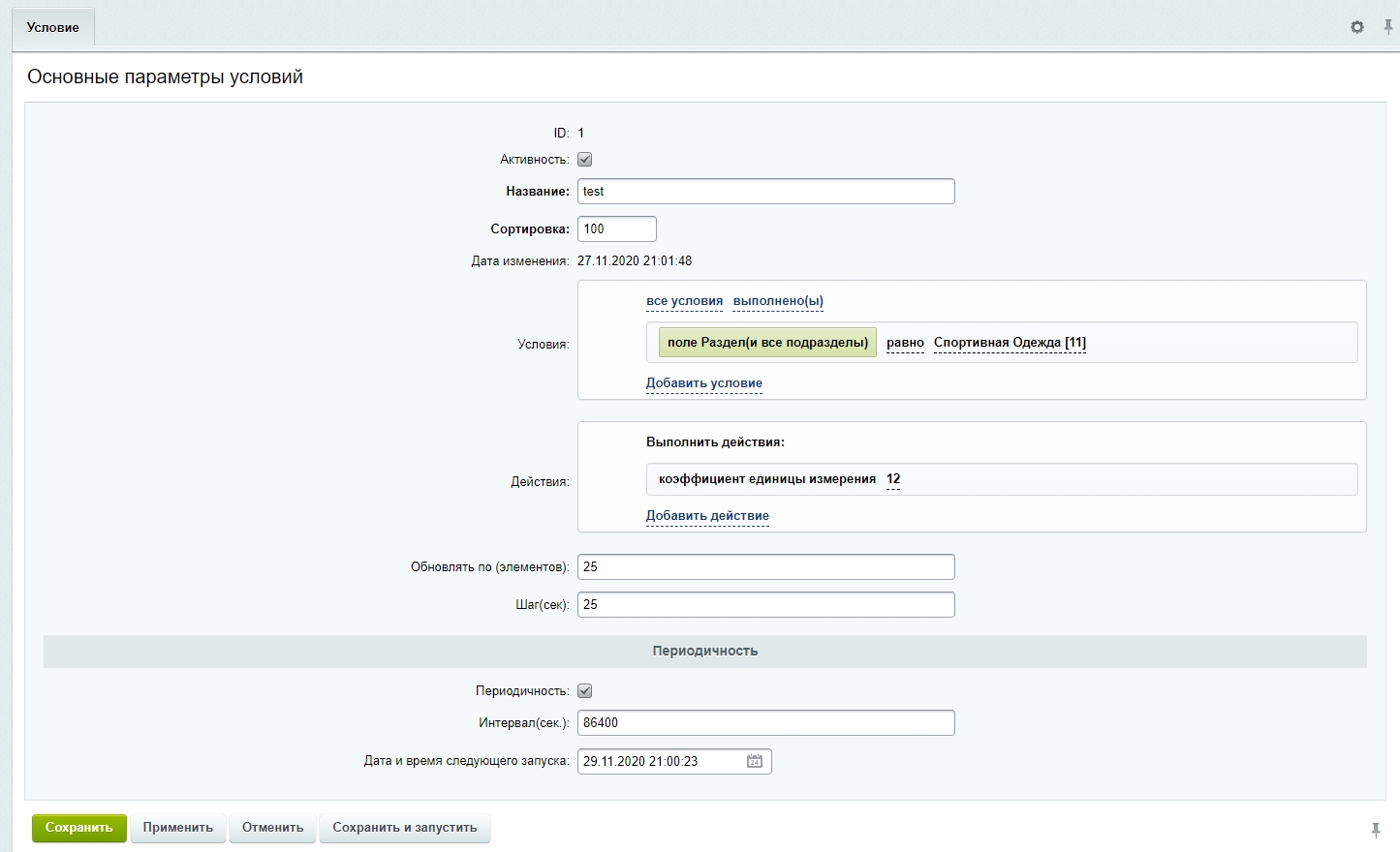- При желании можно включить периодичность, задать время в секундах периодичности и установить дату и время следующего запуска;