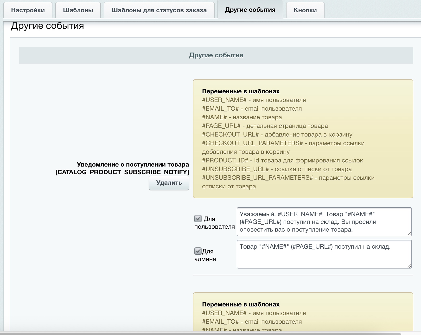 - По умолчанию добавлены шаблоны оповщения пользователя о поступлении товара