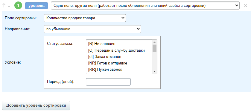 Создадим сразу 2 сортировки и назовем их «Покупают — много» и «Покупают — мало». Для каждой сортировки создаем по 1 правилу. У нас будет 1 уровень сортировки для правила, где полем будет являться «Количество продаж товара». В зависимости от того для какой сортировки мы создаем правило, укажем: направление сортировки, статус заказа и период подсчета. В нашем случае, для правила сортировки «Покупают — много» первый уровень будет выглядеть так (см. рис).