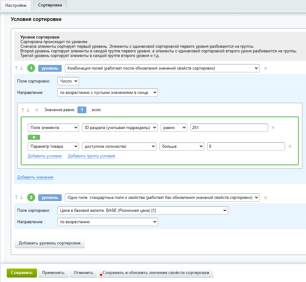 На первом уровне мы отобрали нужные товары, теперь наша задача отсортировать их по цене (от меньшей к большей) на втором уровне сортировки. Для второго уровня нам уже не нужны комбинации полей, поэтому выберем опцию второго уровня - «Одно поле: стандартные поля и свойства». Указываем поле цены, задаем направление и нажимаем кнопку «Сохранить и обновить значения свойств сортировки», чтобы был произведен расчет значений. Наша сортировка готова (см. рис). Осталось только добавить необходимый код в шаблон сайта.