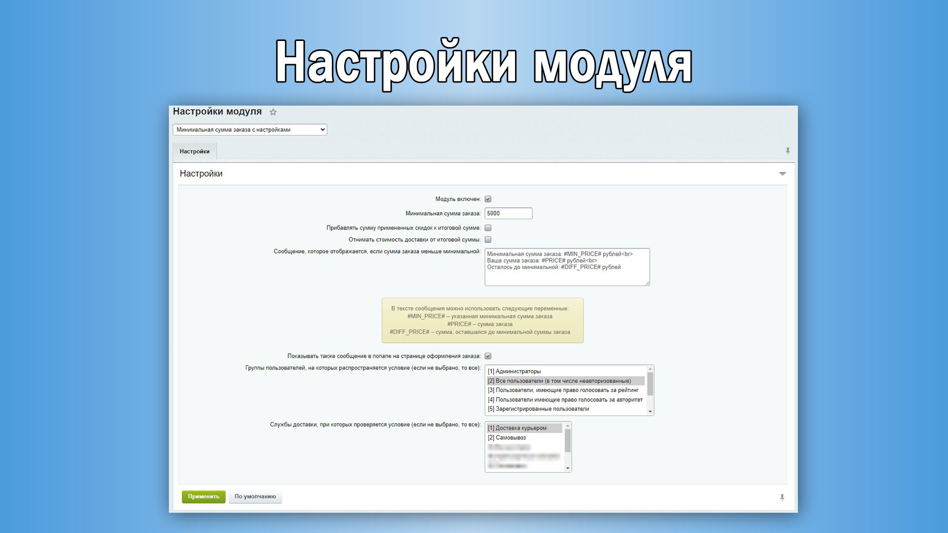 Модуль позволяет указать минимальную сумму заказа, которая требуется для оформления заказа, и при попытке оформления заказа выводит уведомление, если сумма не достигнута.