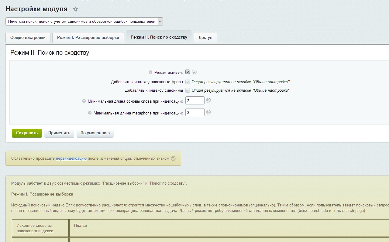 Исходный поисковый индекс Bitrix искусственно расширяется: строится множество «ошибочных» слов, а также слов-синонимов (опционально). Таким образом, если пользователь введет поисковый запрос с ошибкой, который ранее попал в расширенный индекс, ему будет автоматически возвращена релевантная выдача. Данный режим не требует изменений стандартных компонентов.