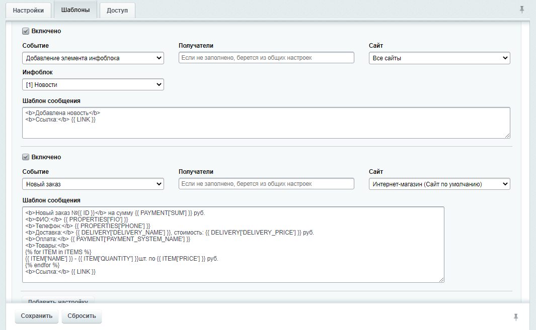 - Для каждого события можно настроить своих получателей. Например, один менеджер отвечает за новые заказы, а другой за оплату заказов.
