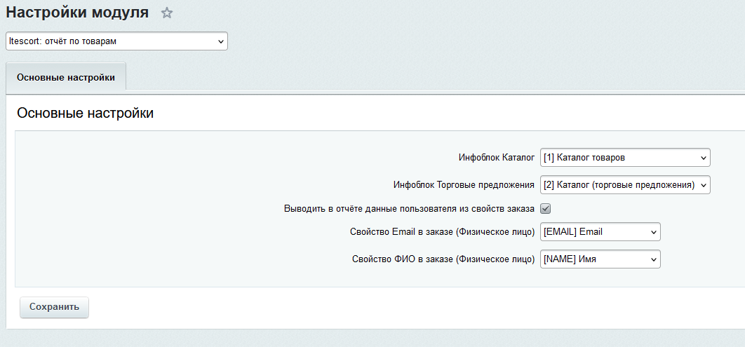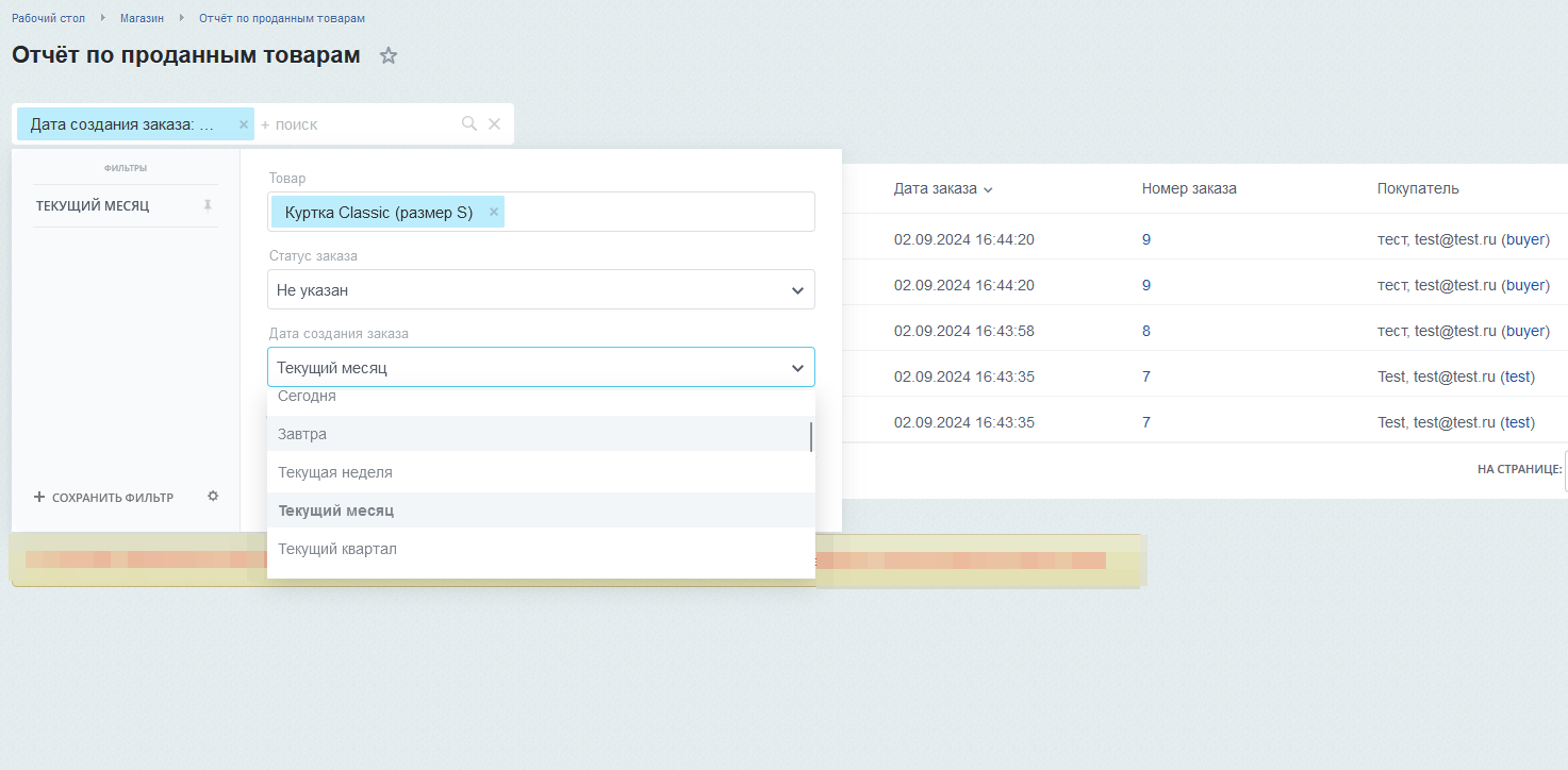 В отчёте можно использовать фильтр по товарам, дате оформления заказа и по статусу заказа.