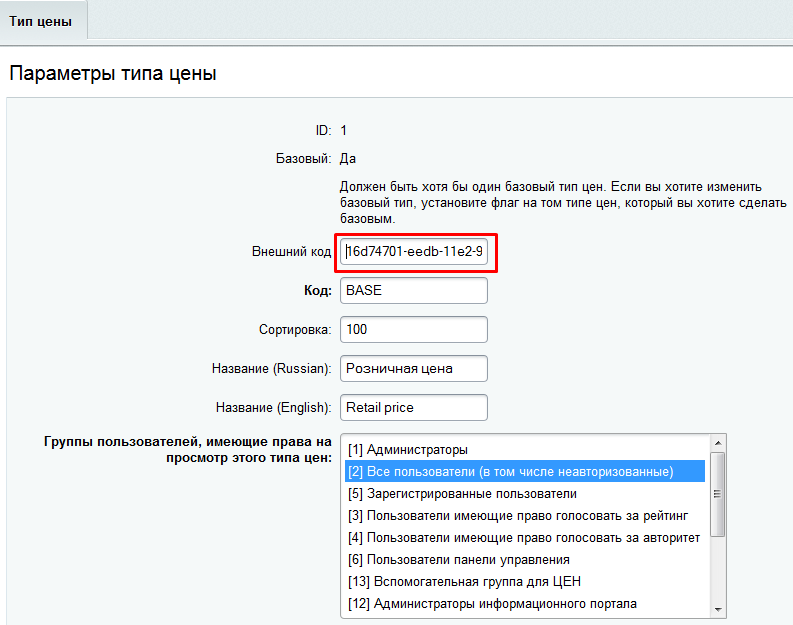 Модуль запрещает обмену изменять код типа цен на сайте, связь происходит по внешнему коду.