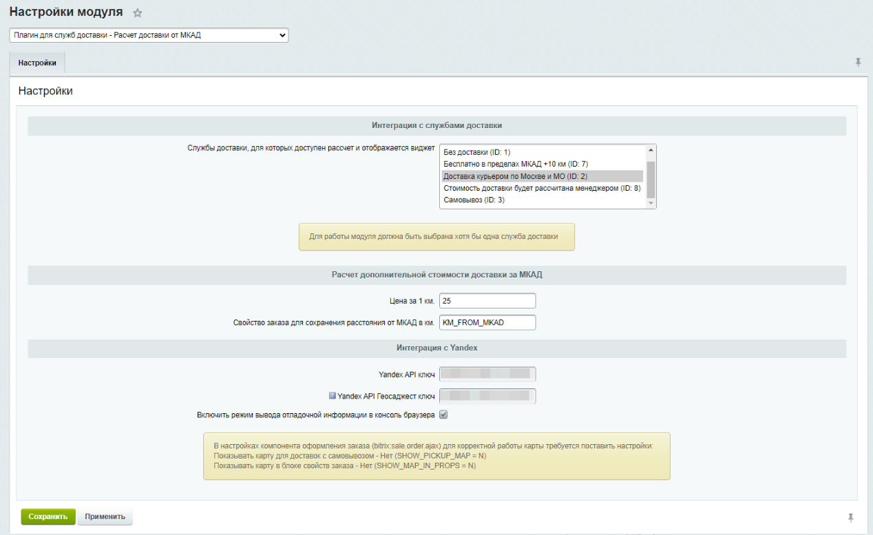 Необходимо создать свойство заказа для указания расстояния в километрах от МКАД до адреса покупателя, а затем указать его в настройках модуля.