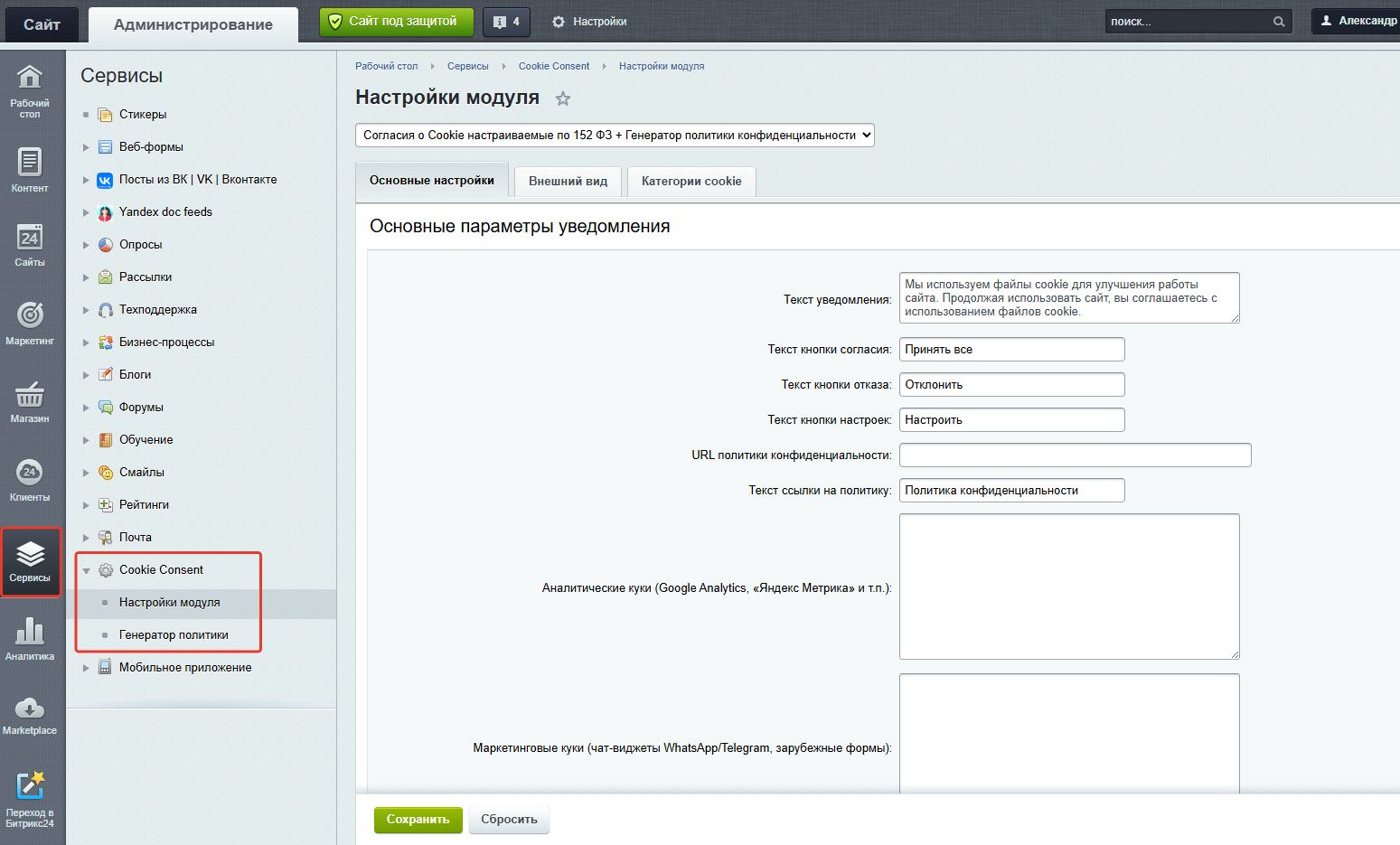 Блокировка cookie: При отказе пользователя модуль автоматически блокирует установку cookie на стороне клиента, предотвращая работу скриптов аналитики и рекламы.