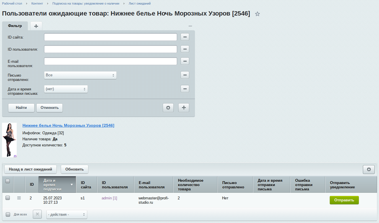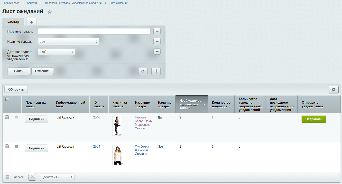 Список подписок доступен в разделе «Администрирование — Контент — Подписка на товары: уведомление о наличии — Лист ожиданий».