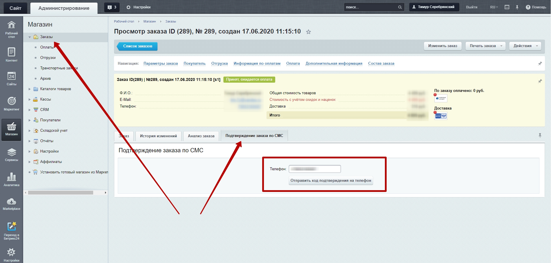 В административной части, в заказе, после установки модуля, появится вкладка "Подтверждение заказа по СМС".