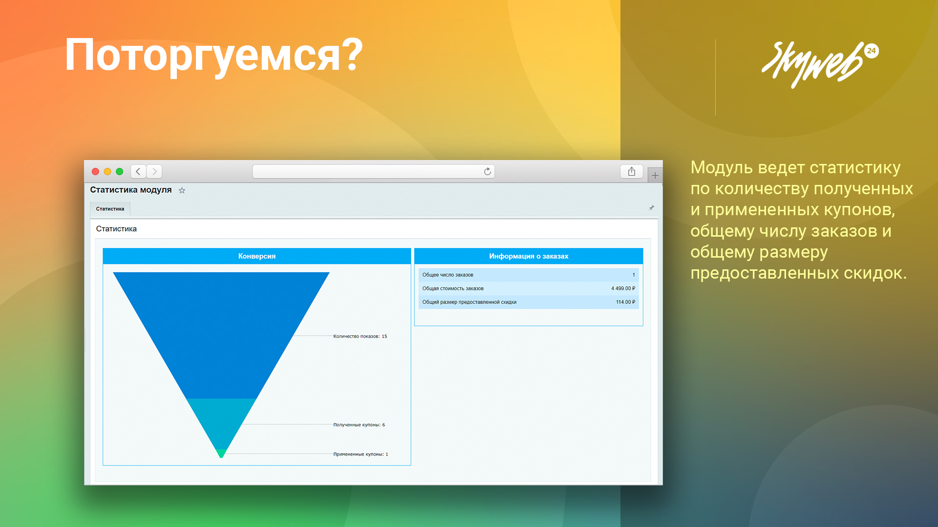 Модуль «Поторгуемся?» - это отличный способ добавить игровую механику на вашем сайте и стимулировать ваших клиентов приобретать товары. С помощью этого модуля вы можете организовать интересный торг, где владелец интернет-магазина может задать варианты торга и размер скидки на товары. Таким образом, вы привлечете внимание клиентов и сможете получить их контактные данные. Кроме того, вы сможете усилить их желание купить товар, предоставив персональный скидочный купон, который